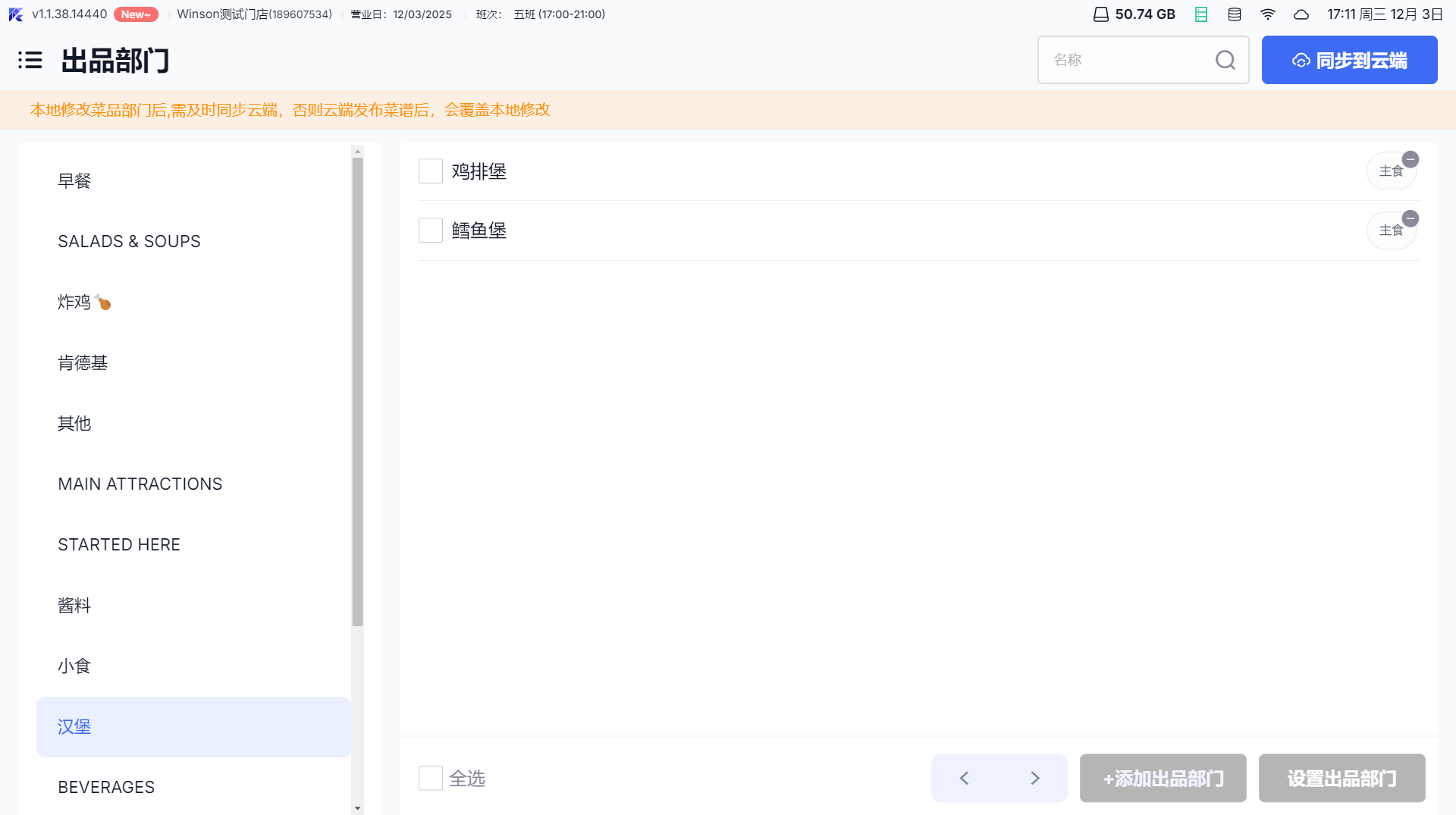 - 若本地修改了菜品信息(如出品部门),点击「同步到云端」,避免 BO 下发数据时覆盖本地设置;
