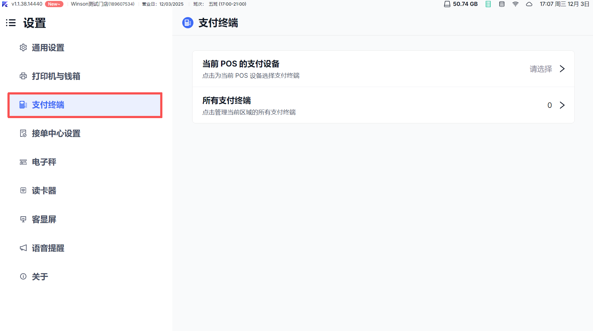 - 页面默认展示「本 POS 使用的支付终端」选择项,及「所有支付终端」管理入口。