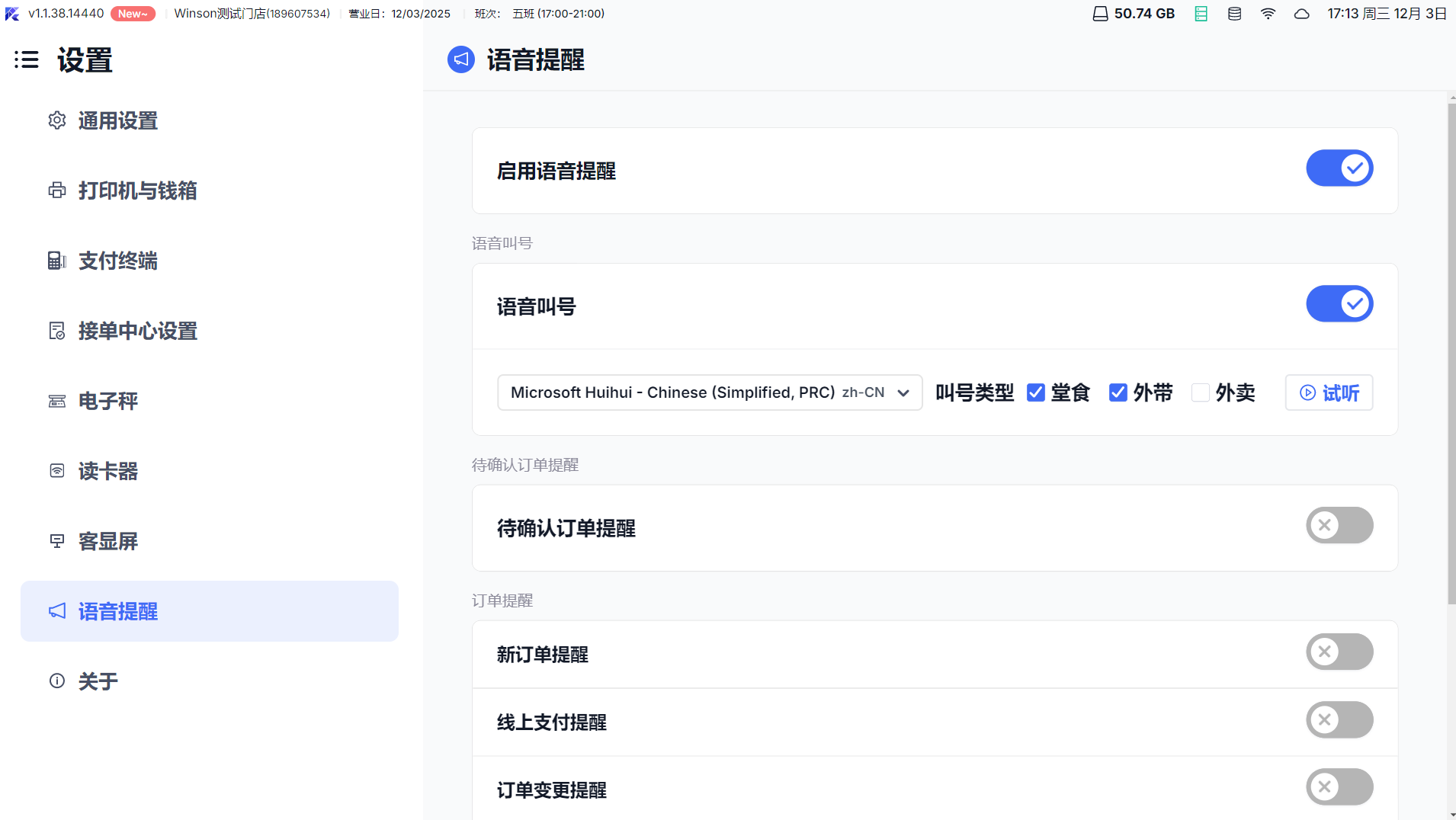 - 语音设置:自定义语音模板(如 “请 {取餐号} 到取餐口取餐”),设置播报次数(0 次仅显示不播报)和间隔(1-10 秒可选);