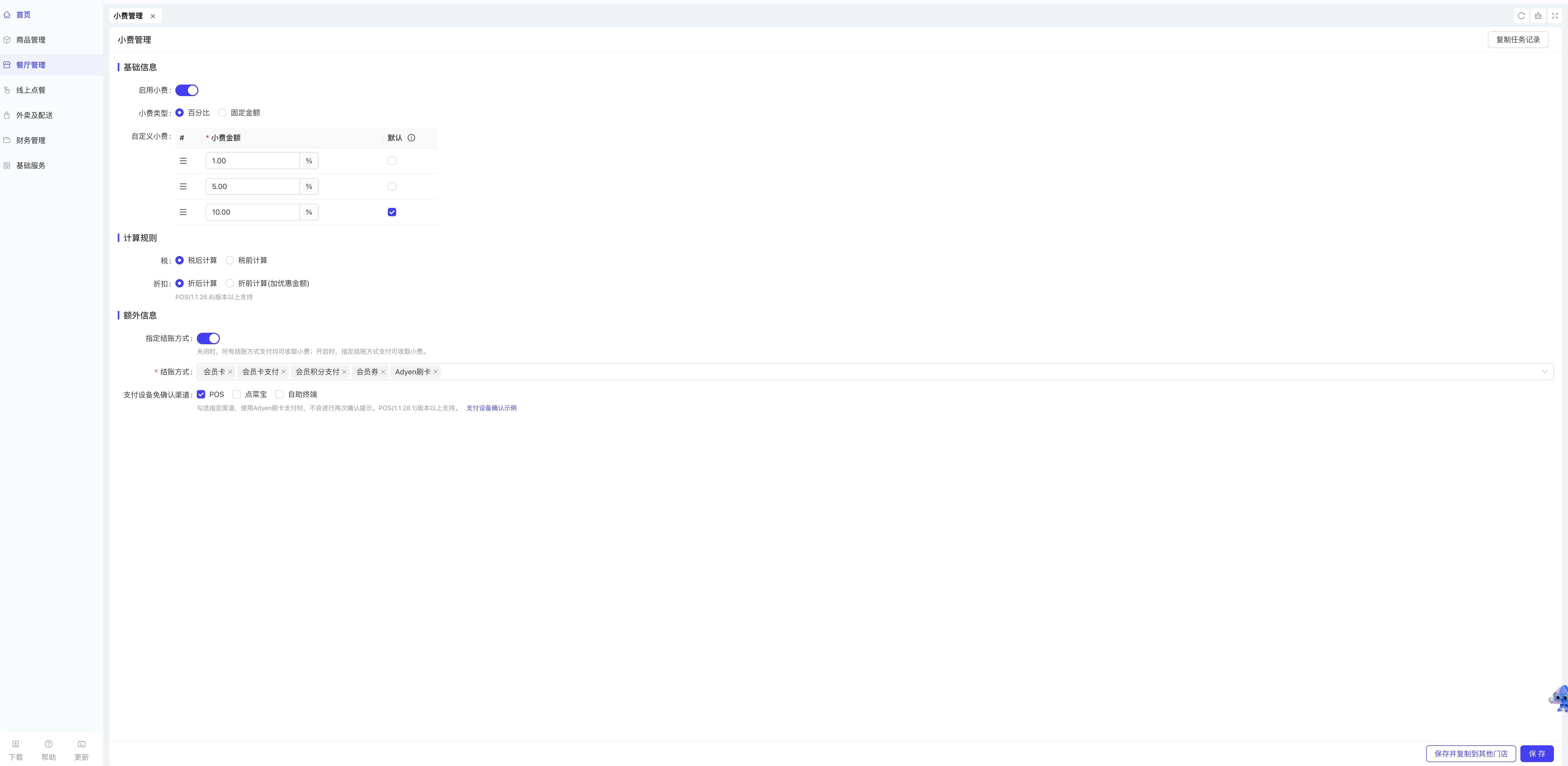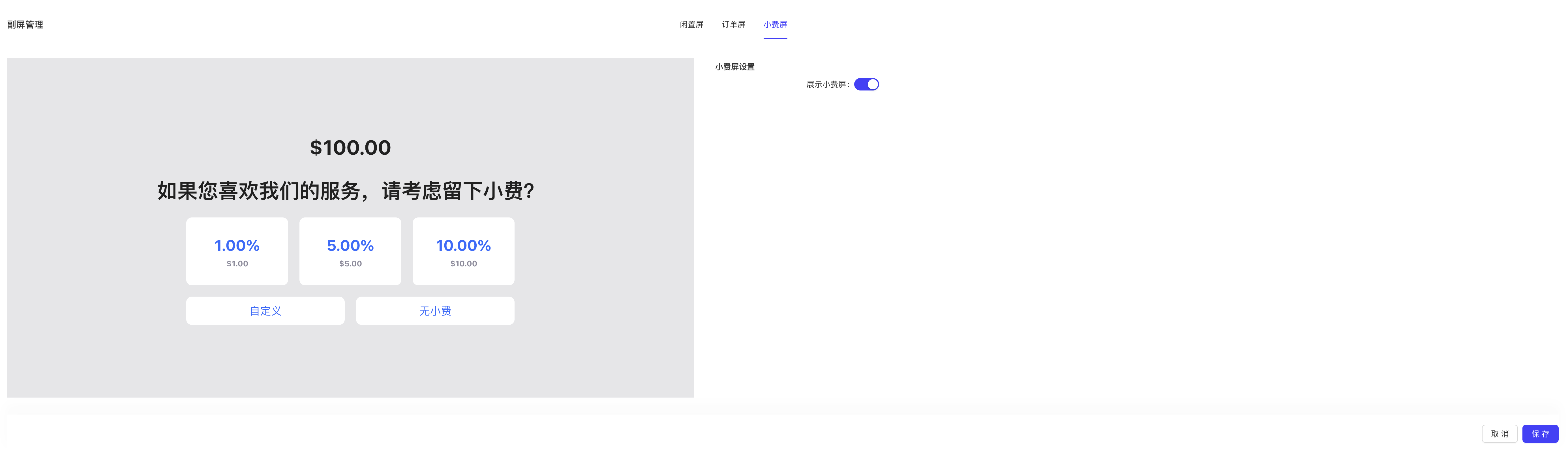 - 小费选择:支付方式开启小费功能时,副屏弹出小费选项,顾客选择后自动计算总金额(购买金额 + 小费);