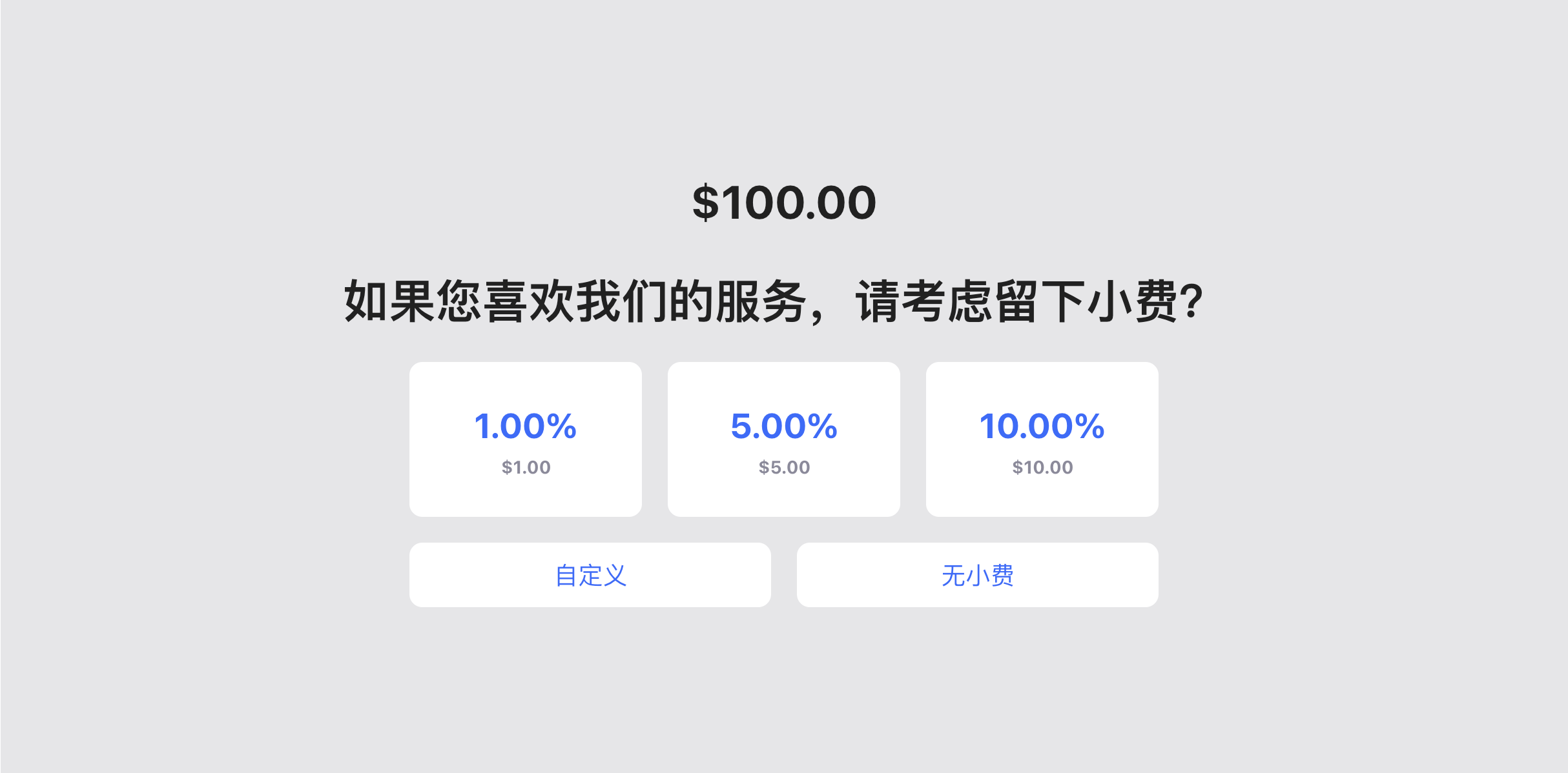 - 页面文案:可自定义小费提示语(默认 “Would you like to leave a tip?”)。