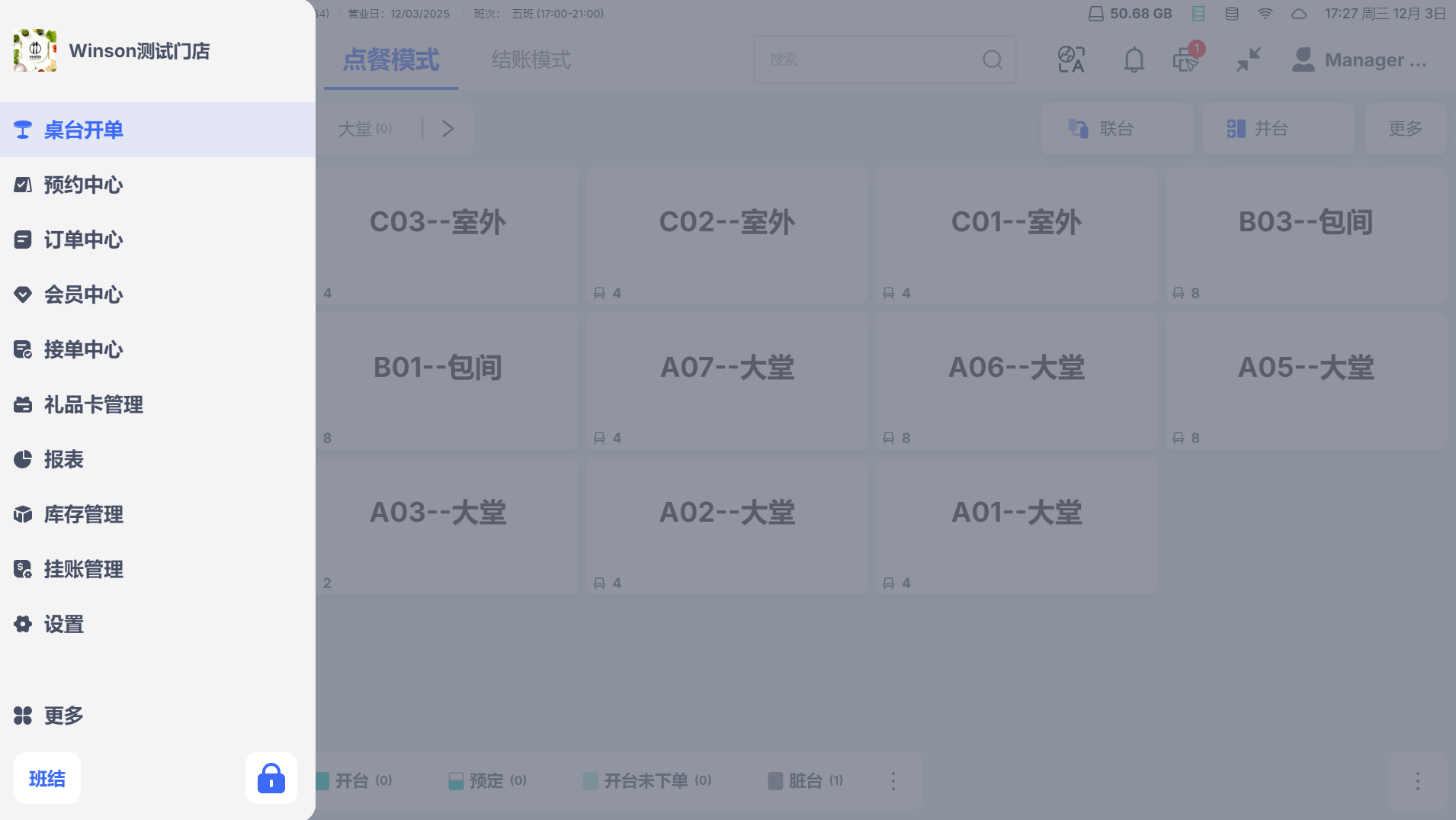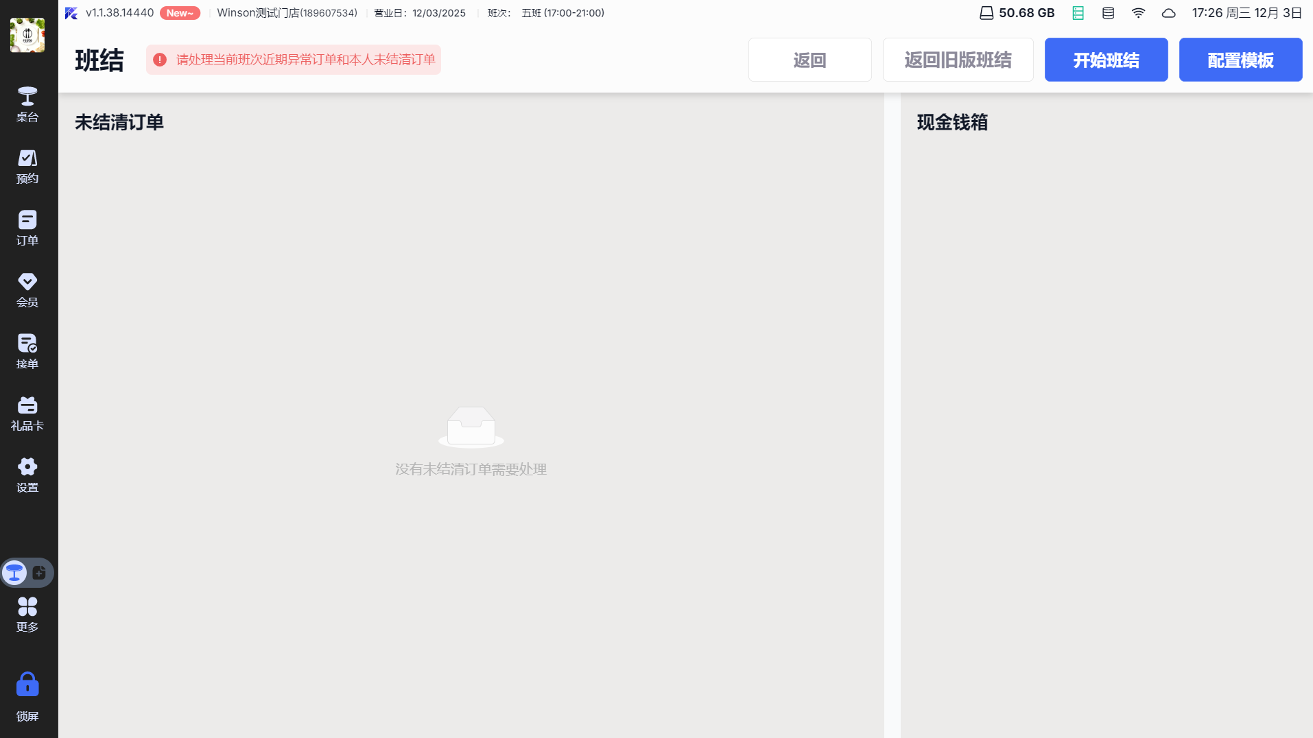 - 班结前需关闭所有未结订单(支付 / 取消 / 转次日);