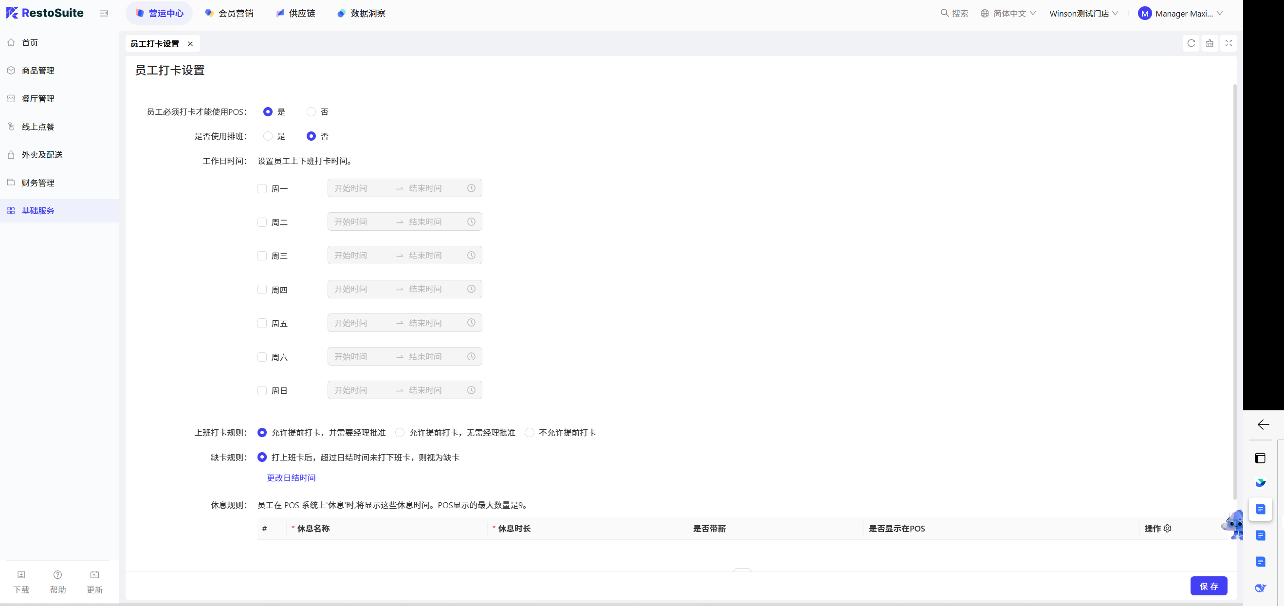 - 休息设置:新增休息类型(如 “15 分钟带薪休息”“60 分钟无薪午餐”),勾选 “在 POS 展示”(最多展示 9 种,至少保留 1 种)。