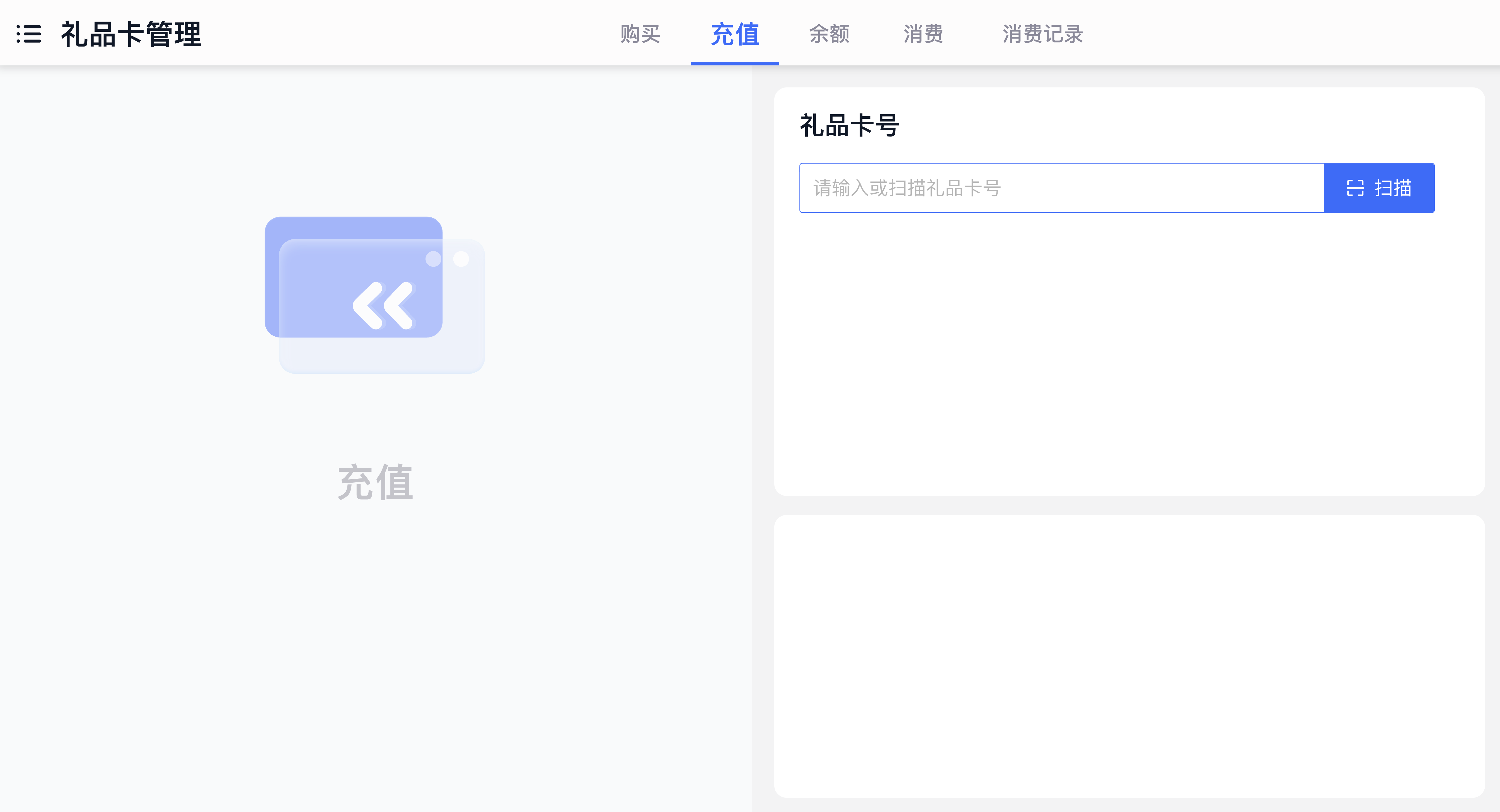 - 录入卡号:扫描或手动输入礼品卡卡号;