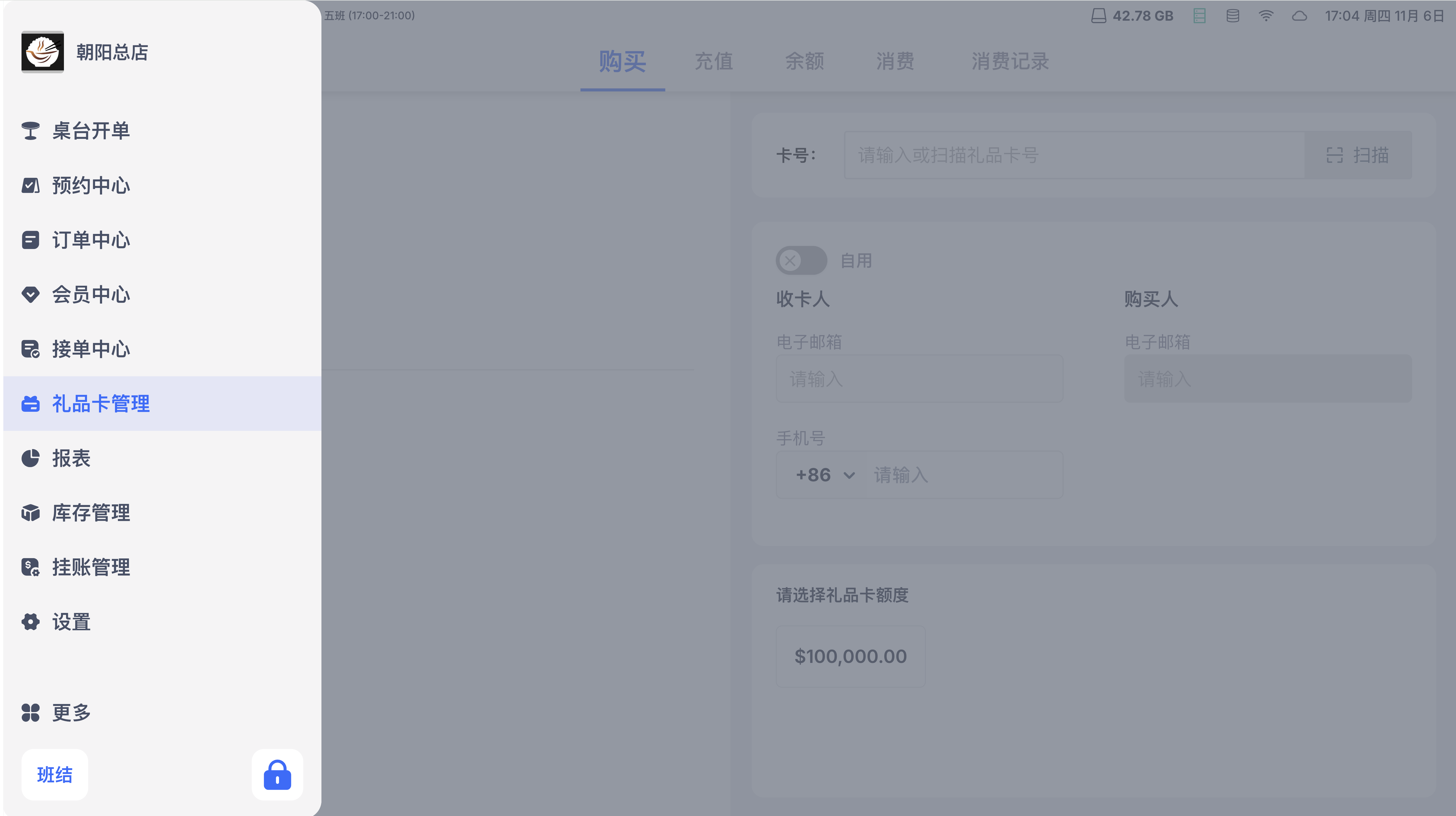 - 主菜单入口:登录 POS 后,点击主菜单「Gift Card」→「购卡」;