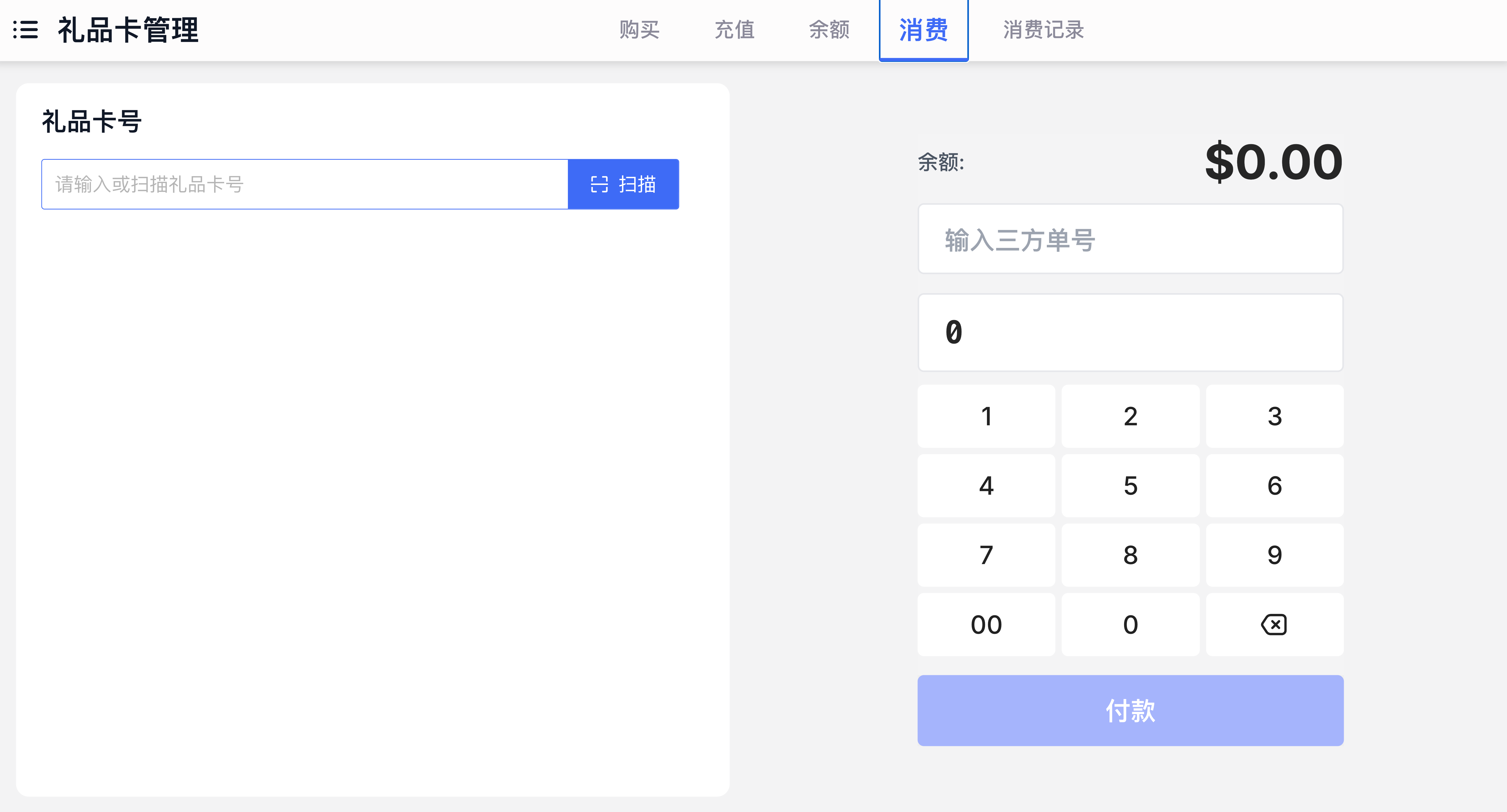 点击「Gift Card」→「消费」tab 页,进入手工消费页面。