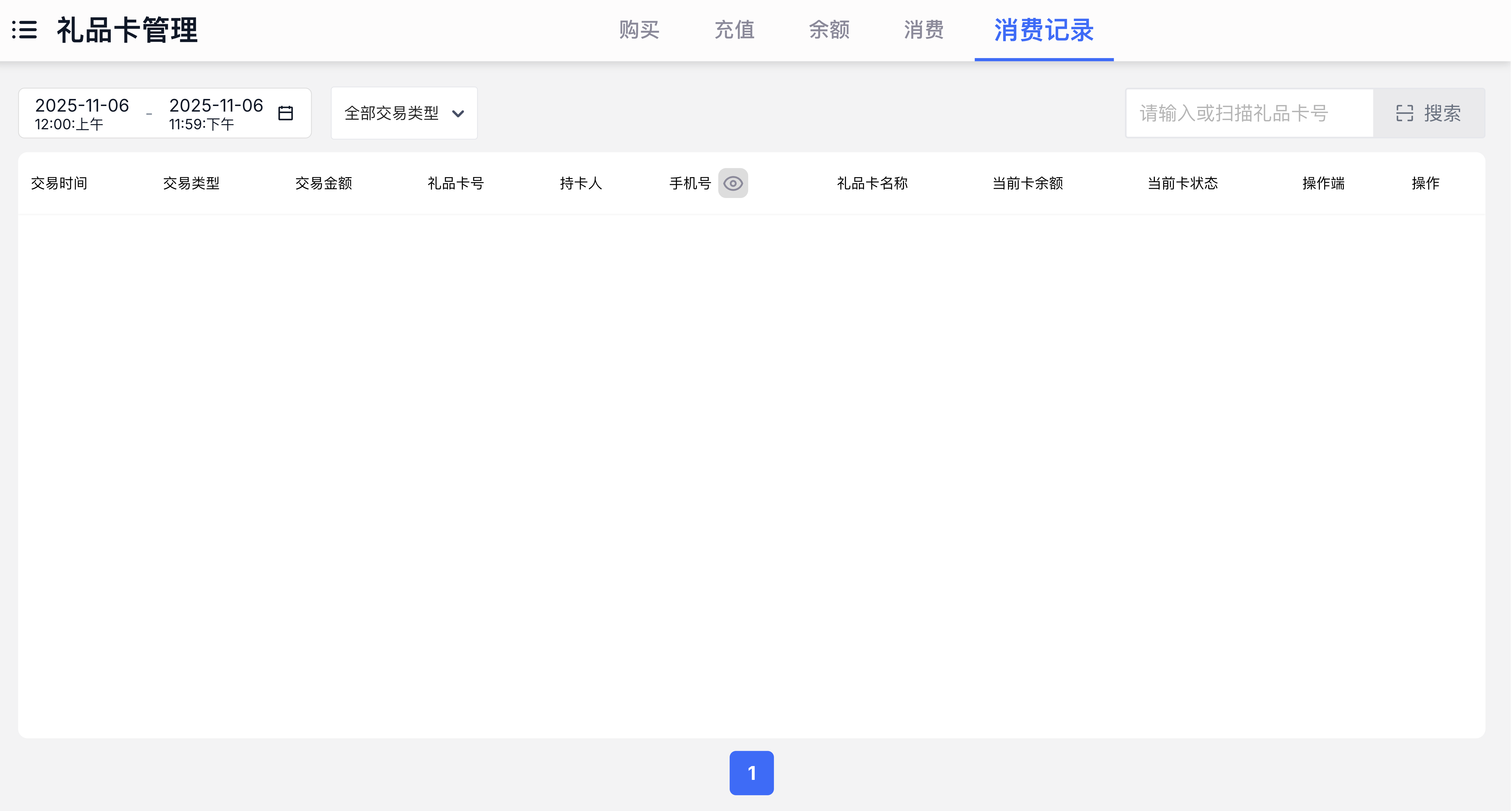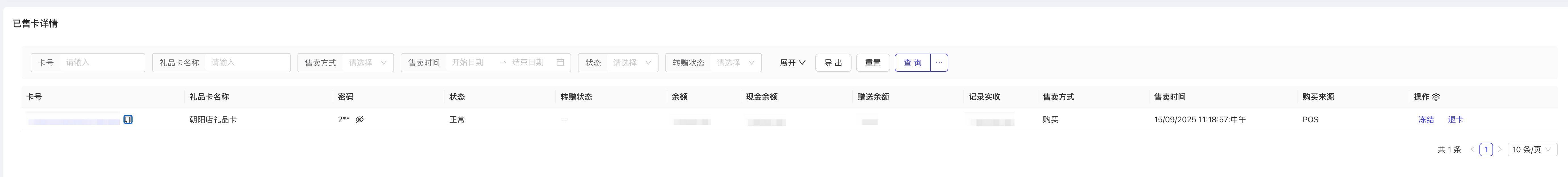 - 按卡号筛选:录入具体礼品卡号,仅显示该卡的购卡、充值、消费、退款记录;