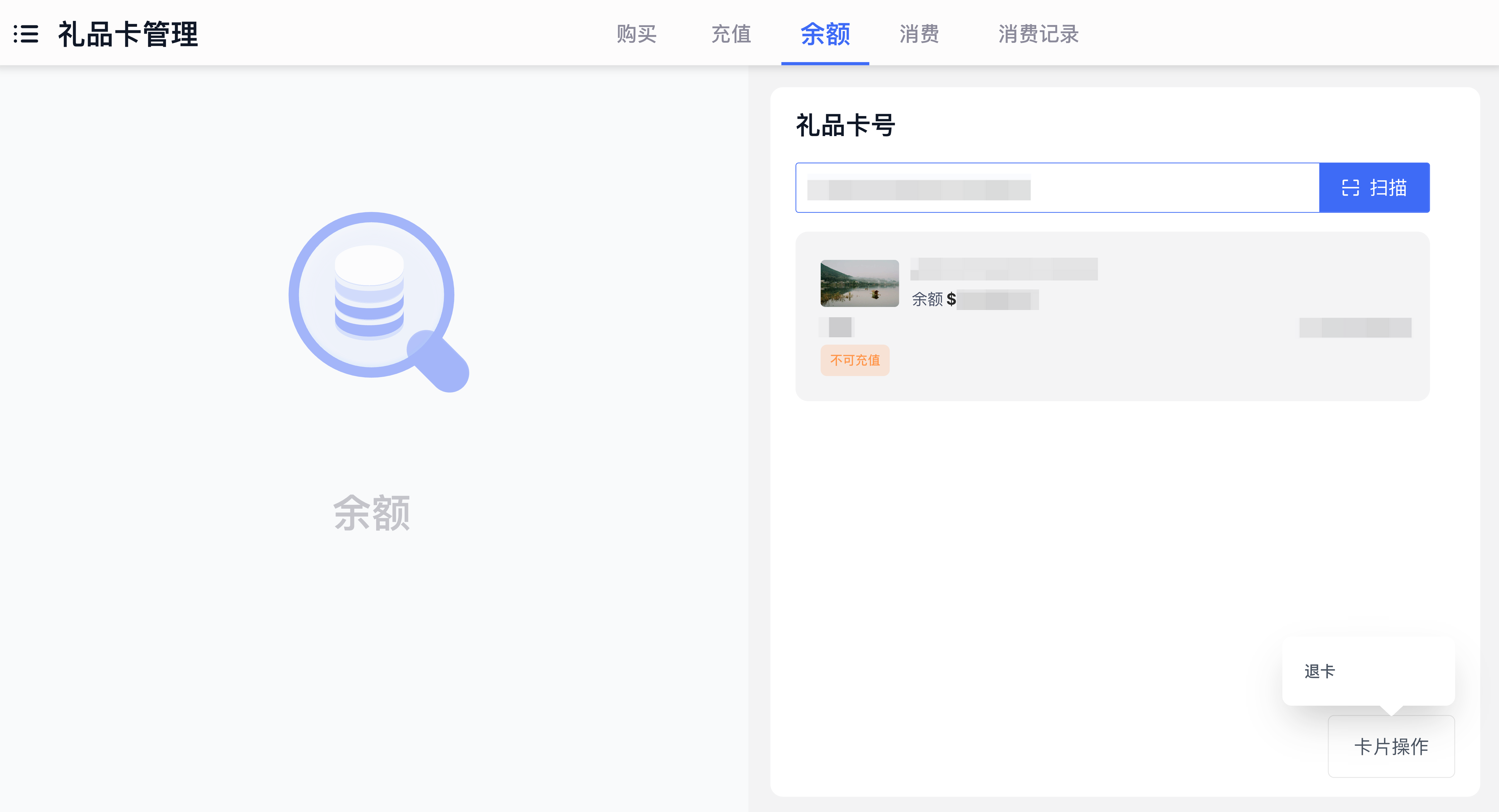 录入卡号:扫描礼品卡或手动输入卡号,系统自动查询卡余额并展示;