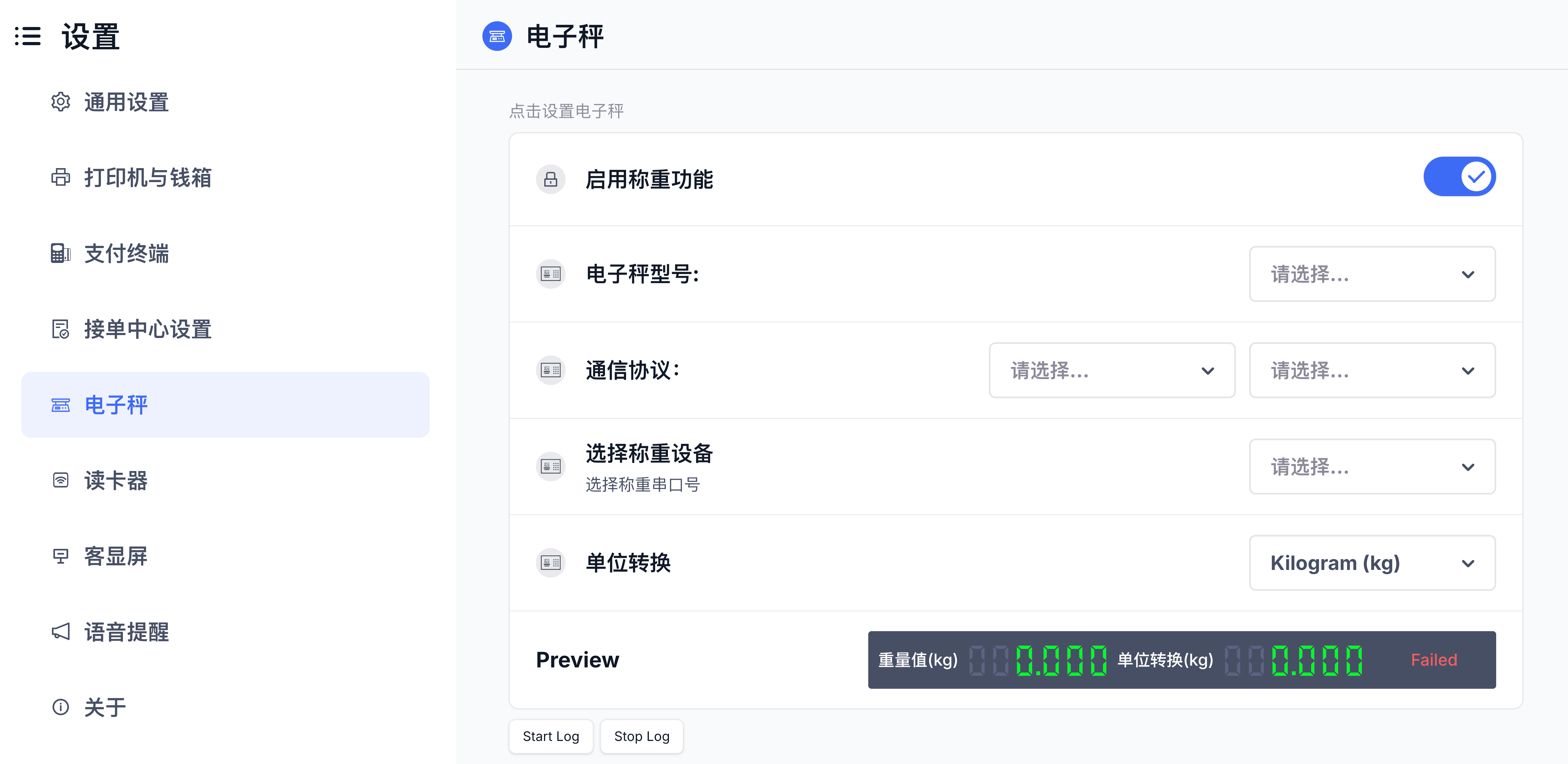 启用电子秤:打开「启用电子秤」开关(关闭时不显示后续设置);