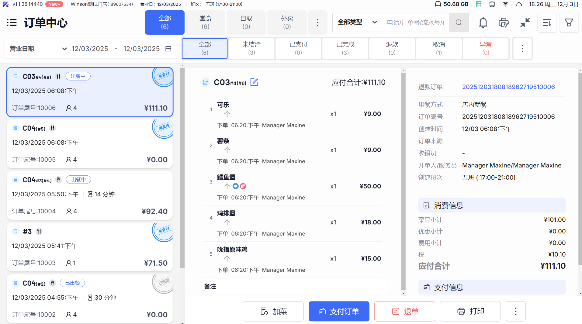 - 登录 POS 系统后,点击主菜单「订单中心」,默认展示「全部订单」列表;