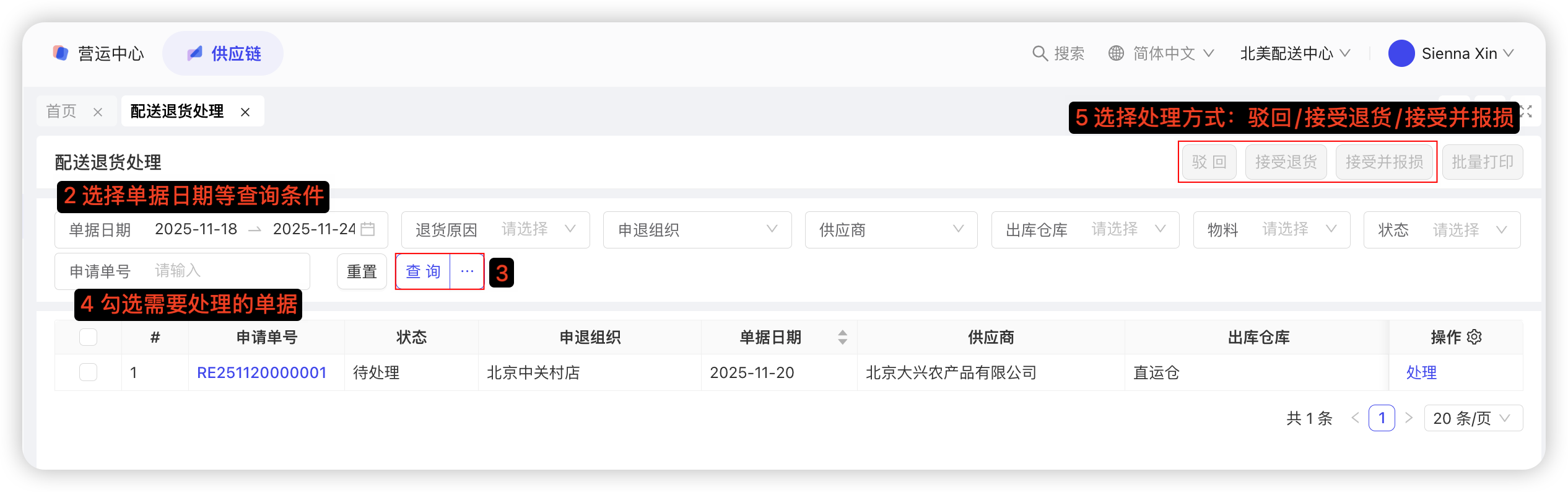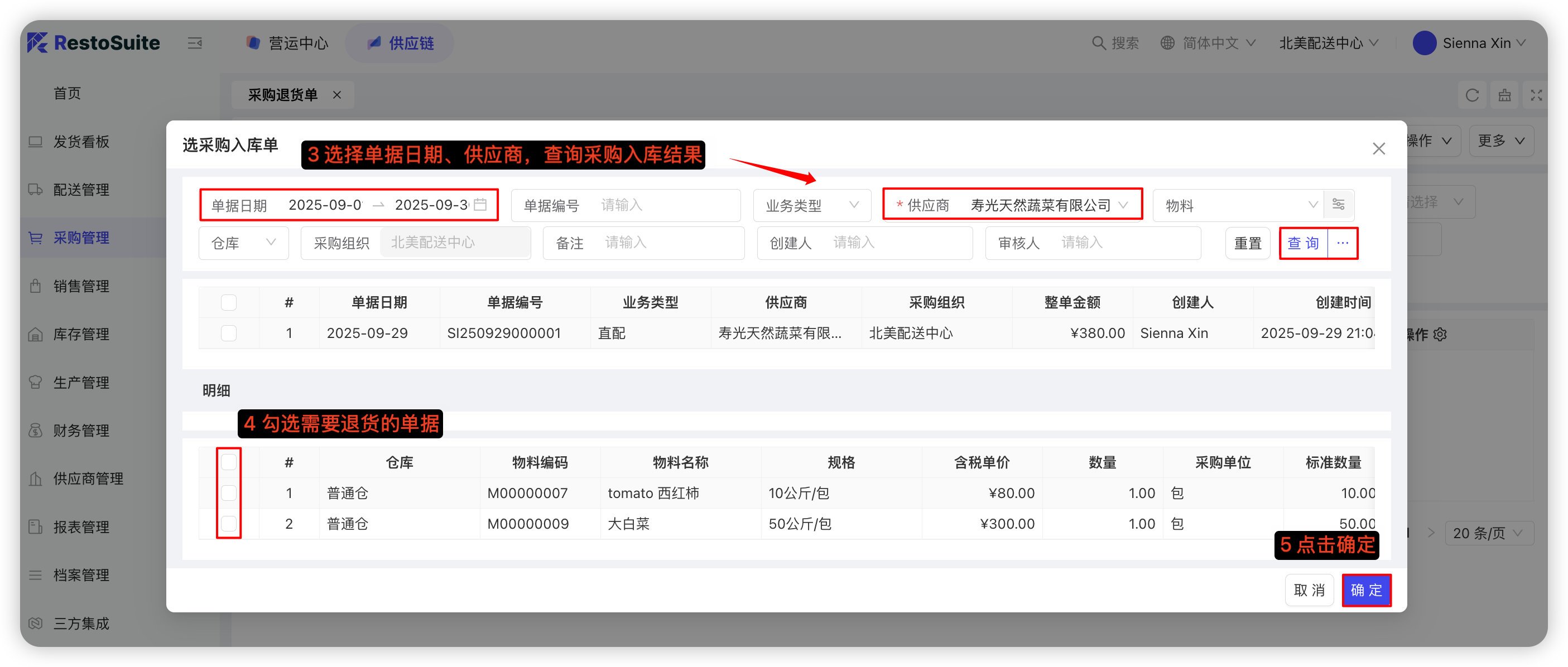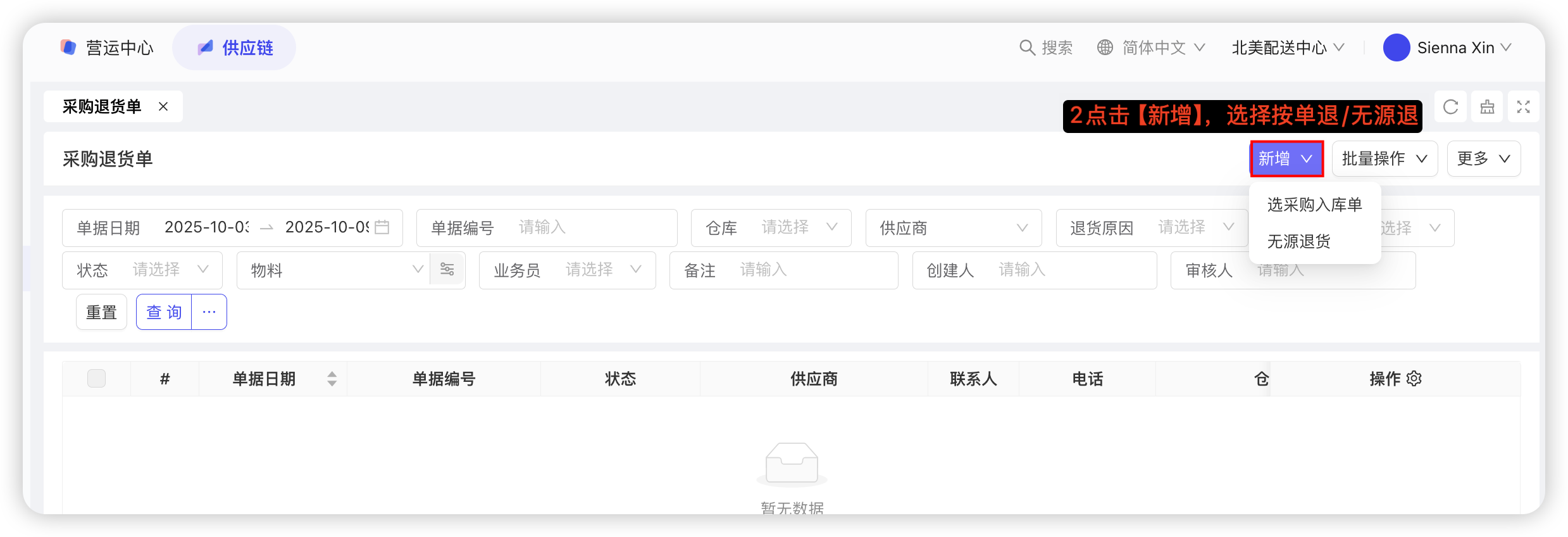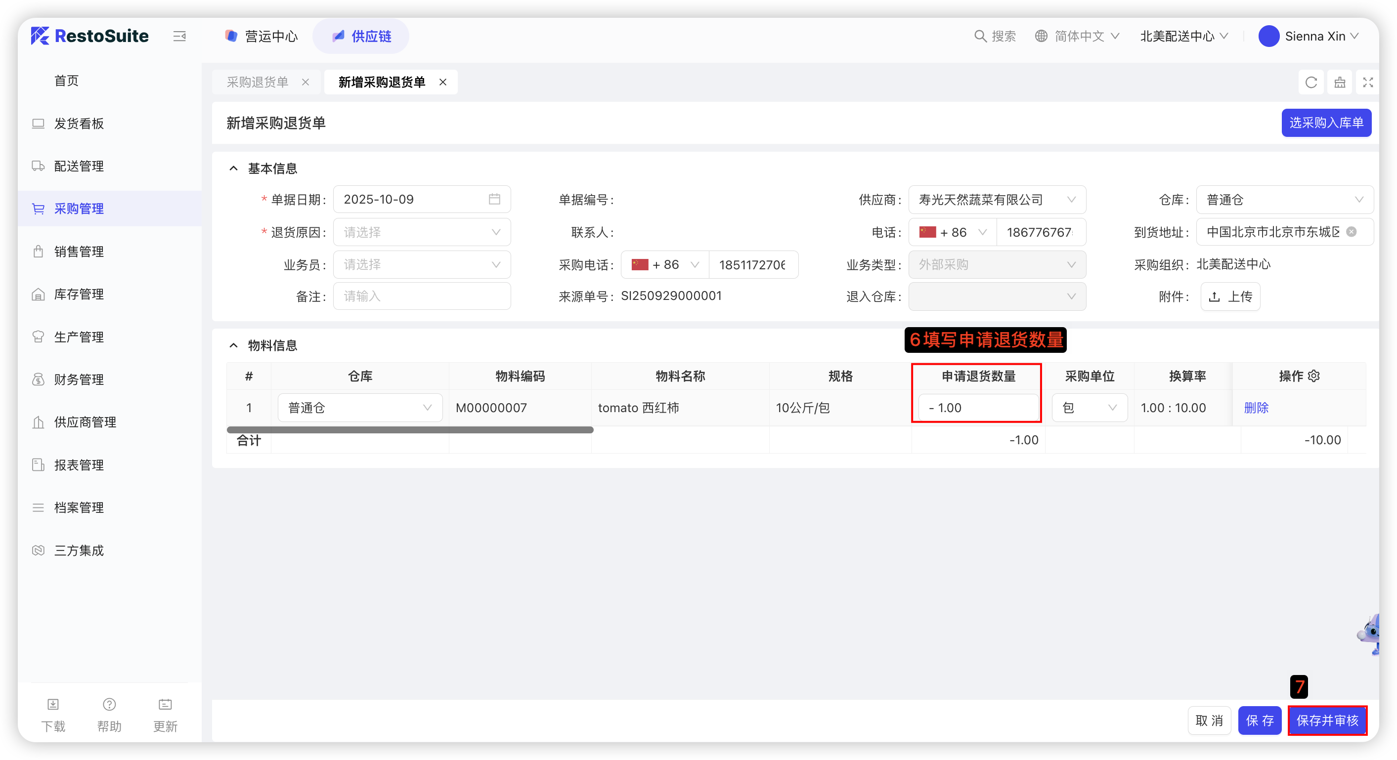【配送中心视角-供应链板块-采购管理-采购退货单】—点击【新增】,选择按采购入库单新增/无源退货,若选择采购入库单退货,则点击【选采购入库单】—选择单据日期、供应商,点击查询—勾选需要退货单据—点击确定—填写申请退货数量—点击【保存并审核】,具体截图如下: