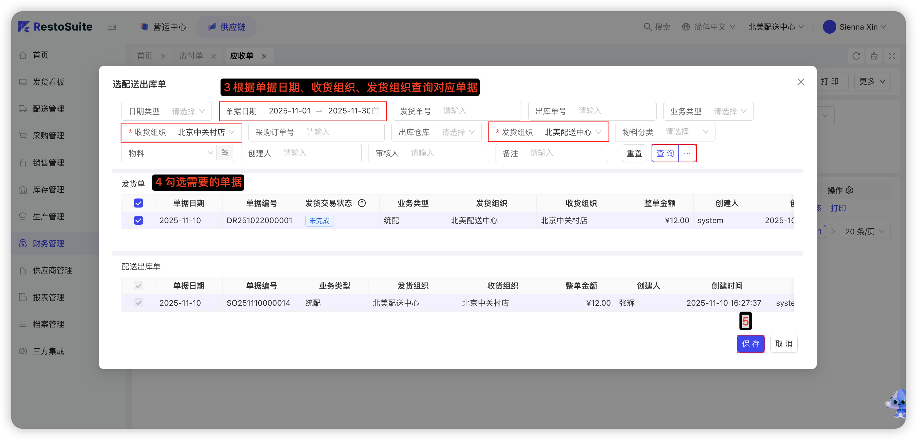 【集团视角/配送中心视角-供应链板块-财务管理-应收单】—点击【新增-选配送出库单/选配送出库退货单】—根据单据日期、收货组织、发货组织查询对应的单据—勾选单据—点击【保存】: