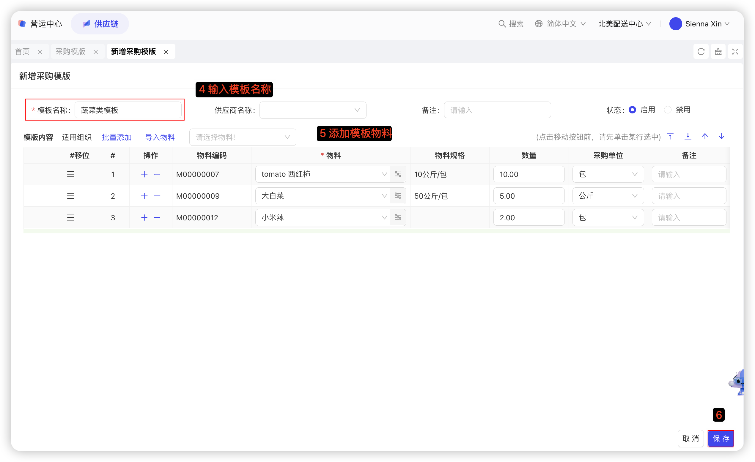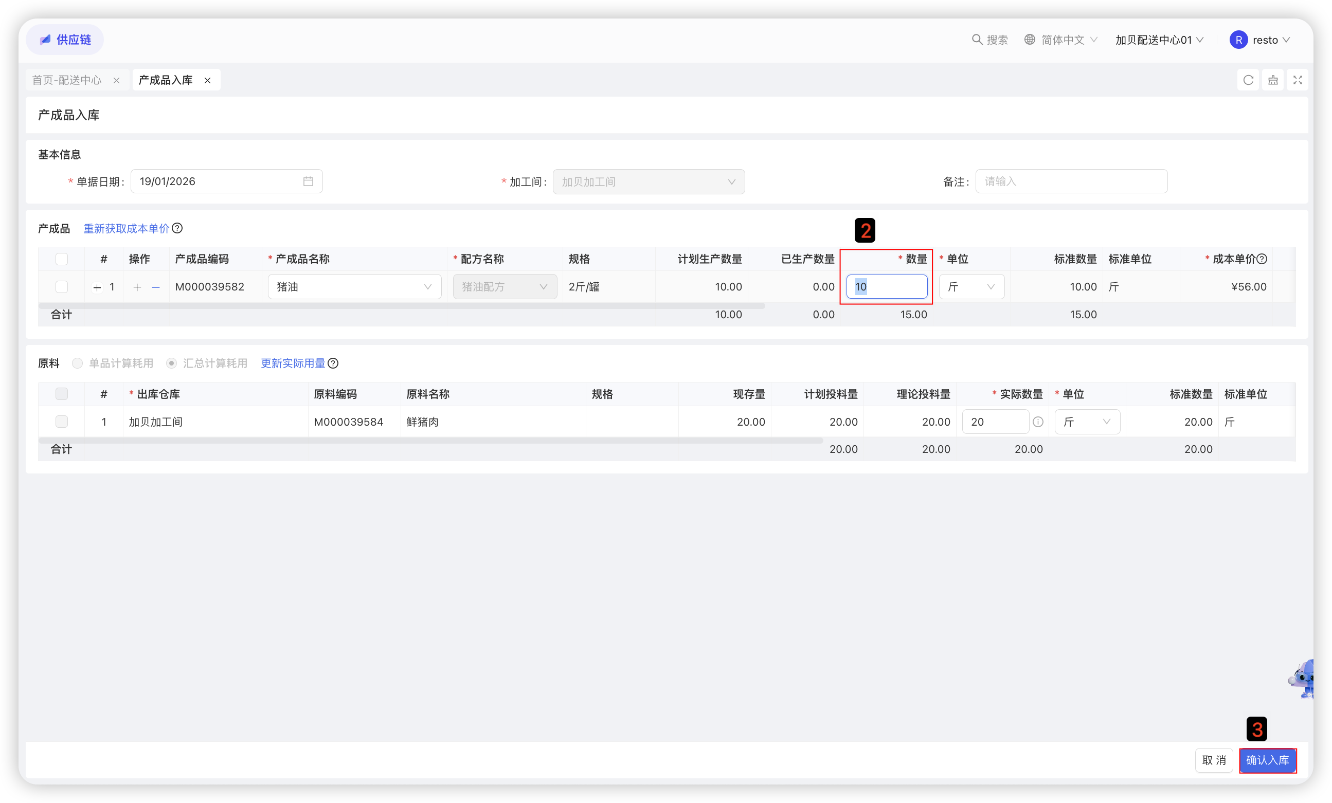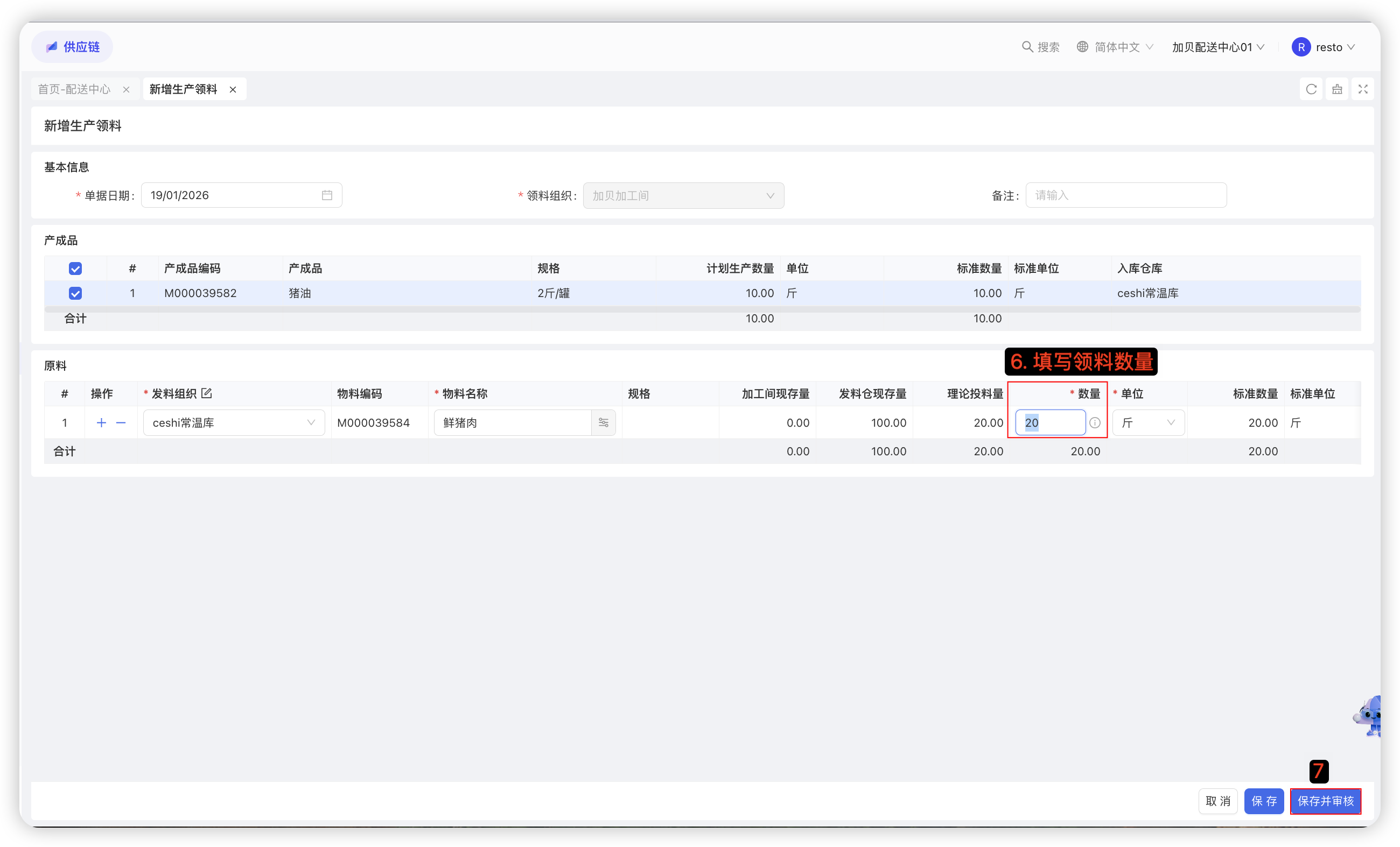 本功能用于记录配送中心采购员向外部供应商的采购具体物料的数量及价格,是采购的合规依据。