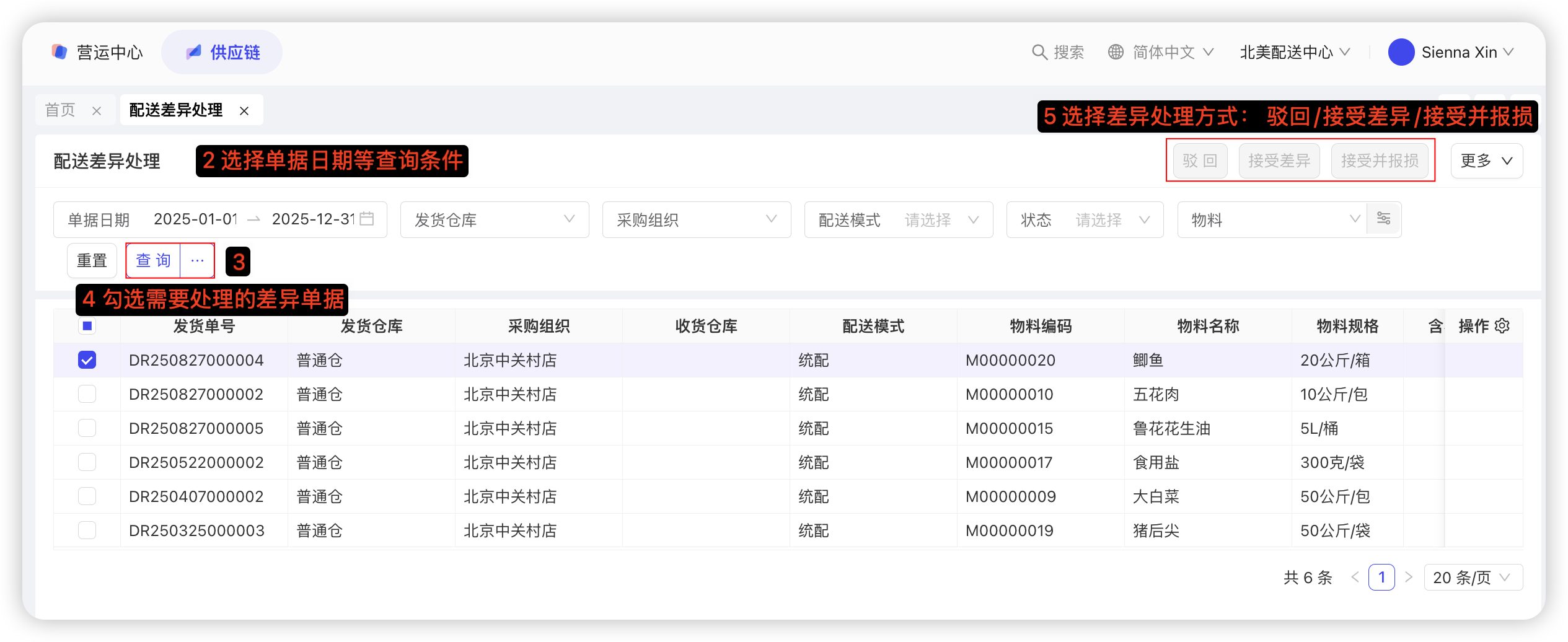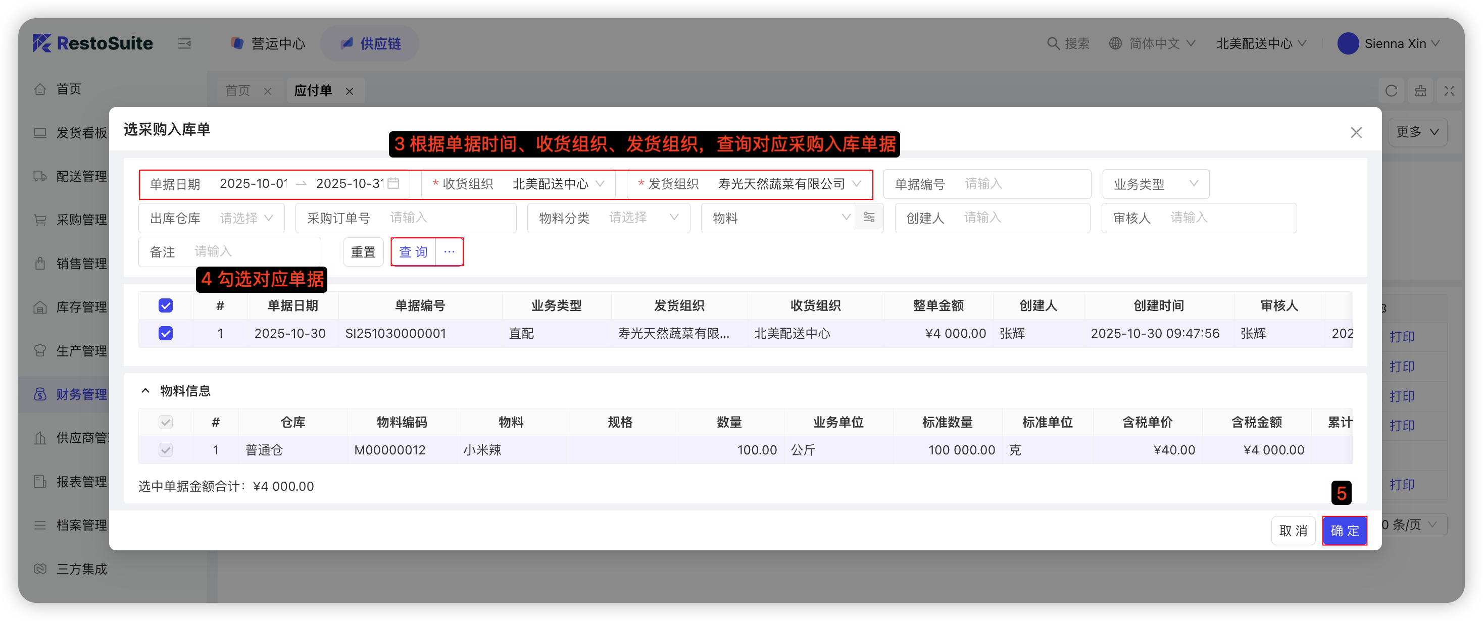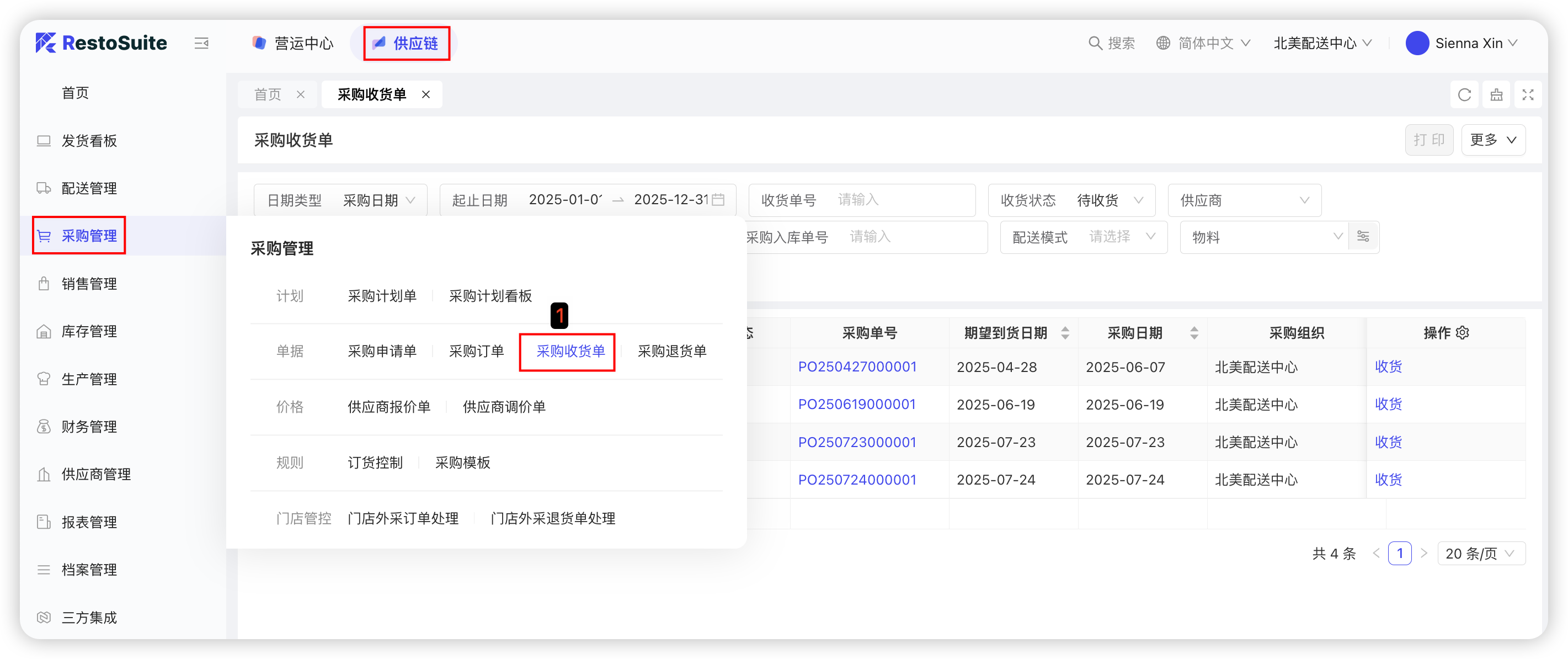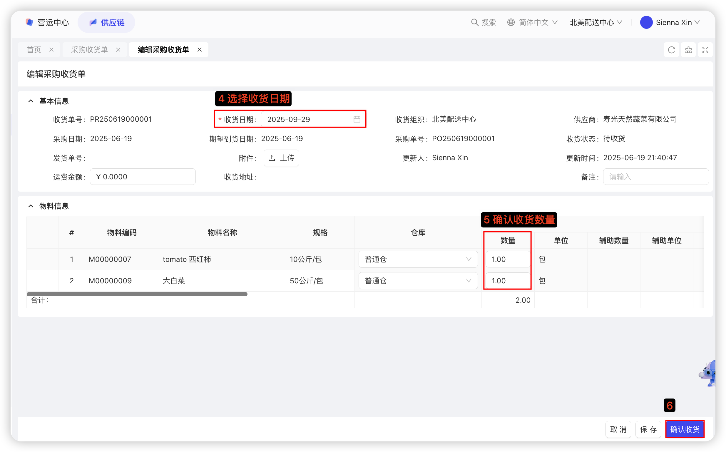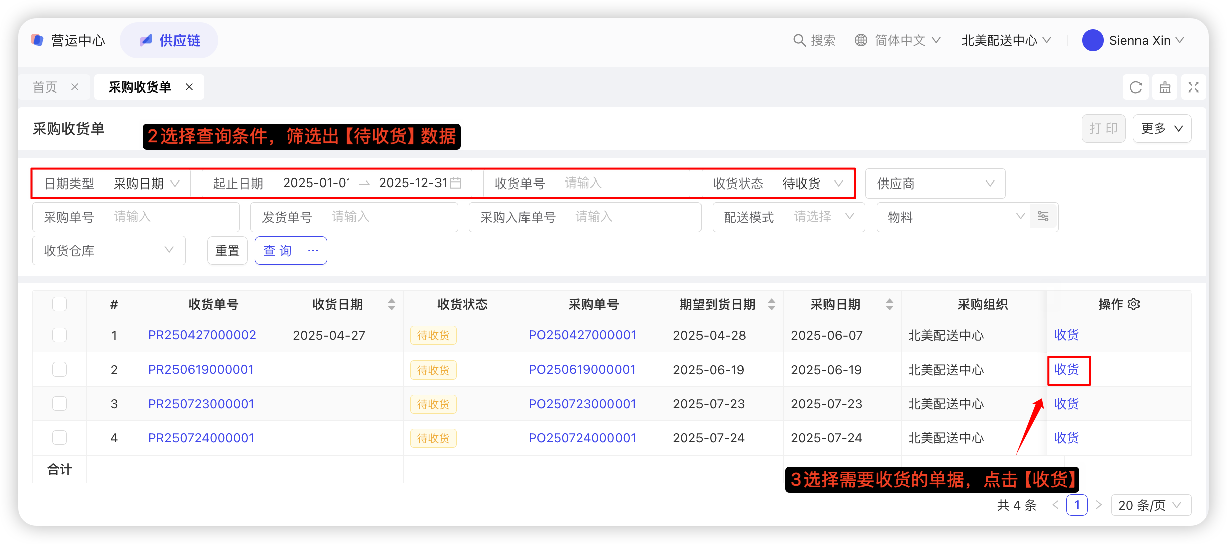 【配送中心视角-供应链板块-采购管理-采购收货单】—选择查询条件,筛选出【待收货】数据—选择需要收货的单据,点击【收货】—选择收货日期—确认收货数量—点击【确认收货】,具体截图如下: