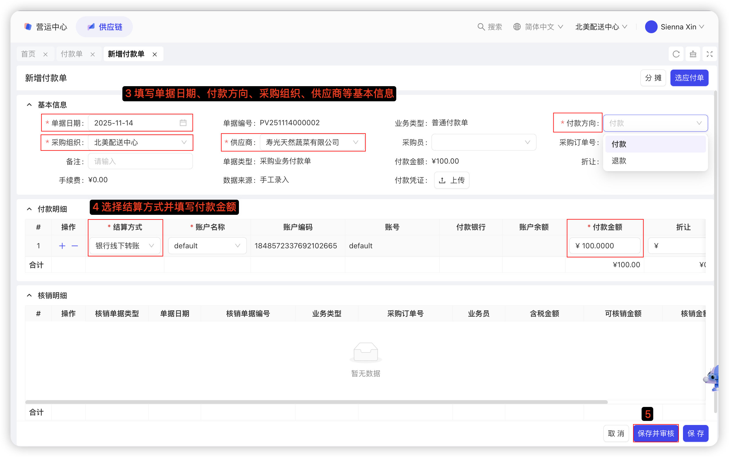 本功能用于预付款&普通付款业务处理,支持付款/退款、支持红蓝单对冲付款、支持部分结算。预付款单:向中心充值,或预付款给供应商;普通付款单:支持用账户余额/线下付款,进行应付核销。