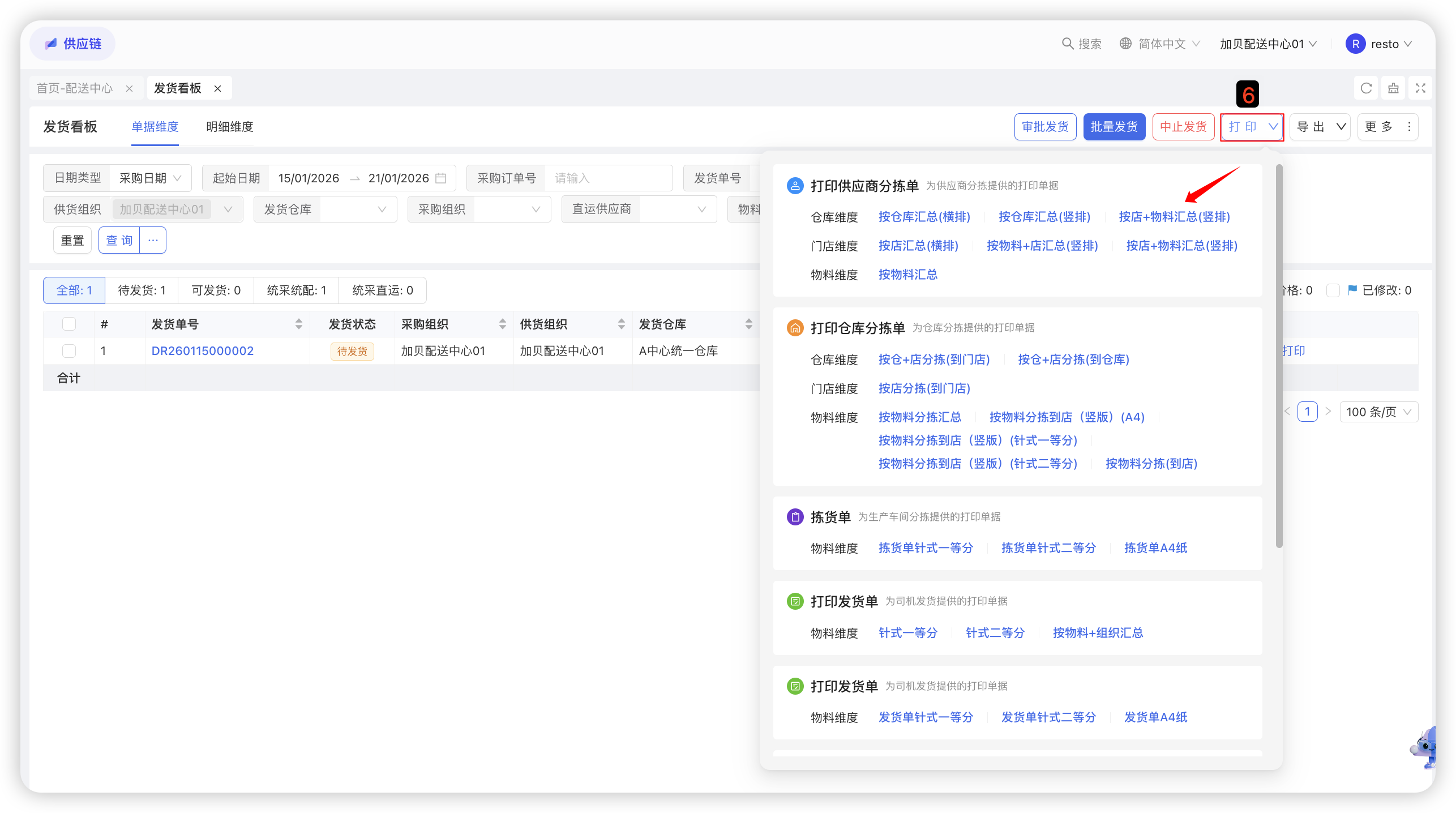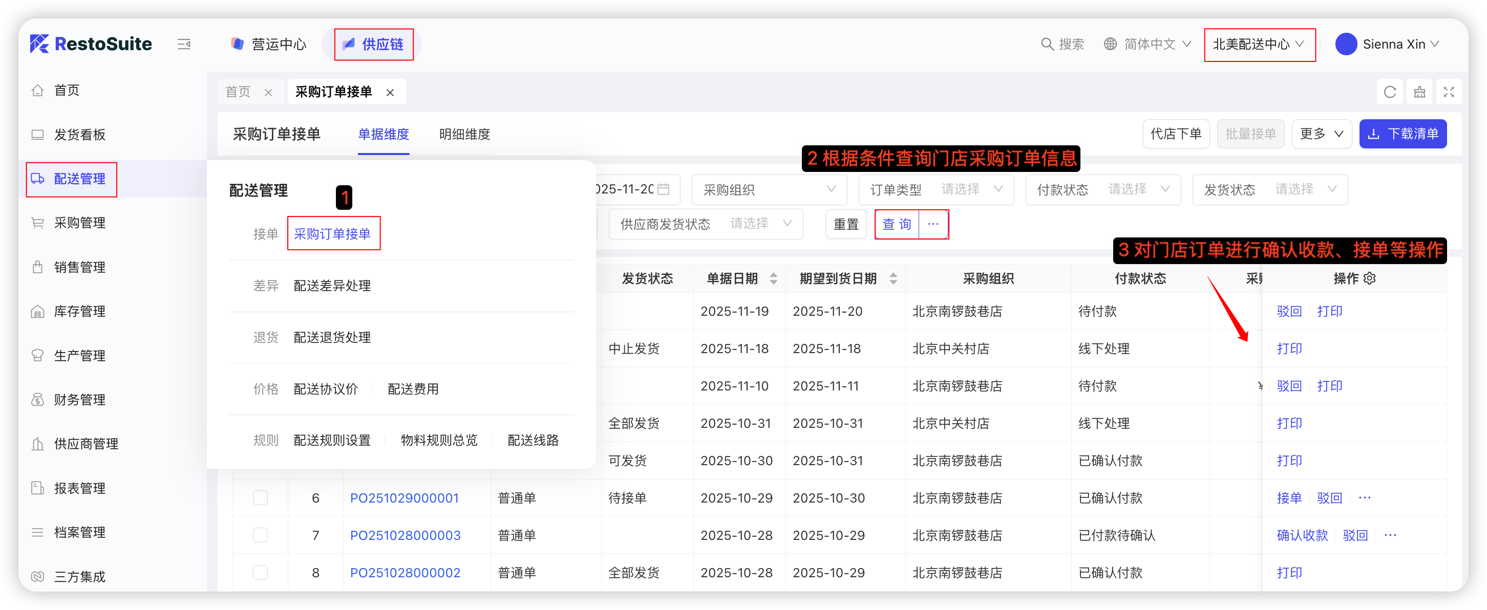 - 配送中心发货给门店,对账后进行收款;