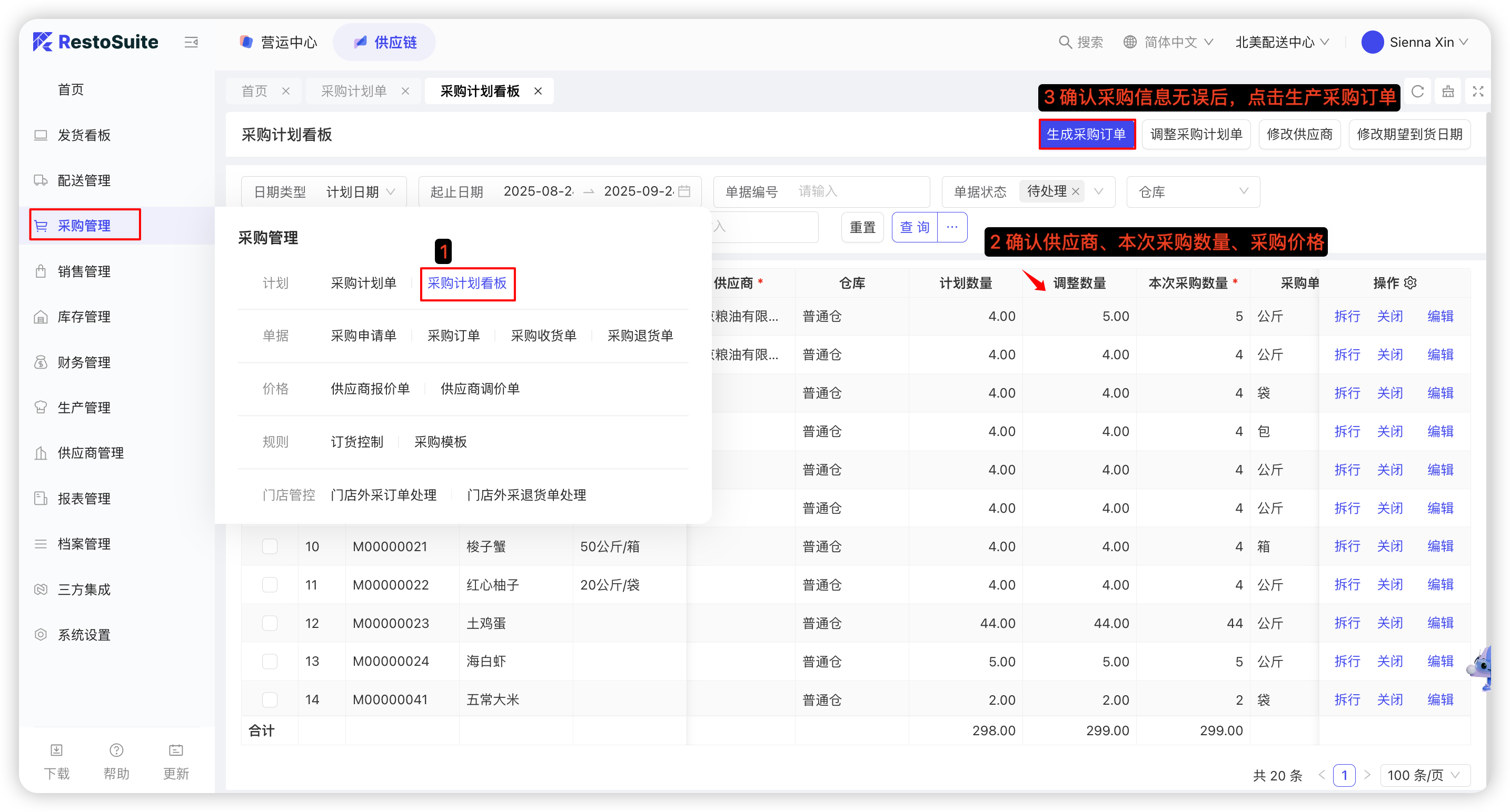 仓库采购计划审核后,会自动流转到采购计划看板,由采购人员根据采购计划进行线下询价,确定最终的采购数量、供应商及价格。操作步骤如下:点击【采购计划看板】—系统会根据配送规则及供应商报价单自动匹配,支持调整—确认无误后,点击【生成采购订单】;如下图: