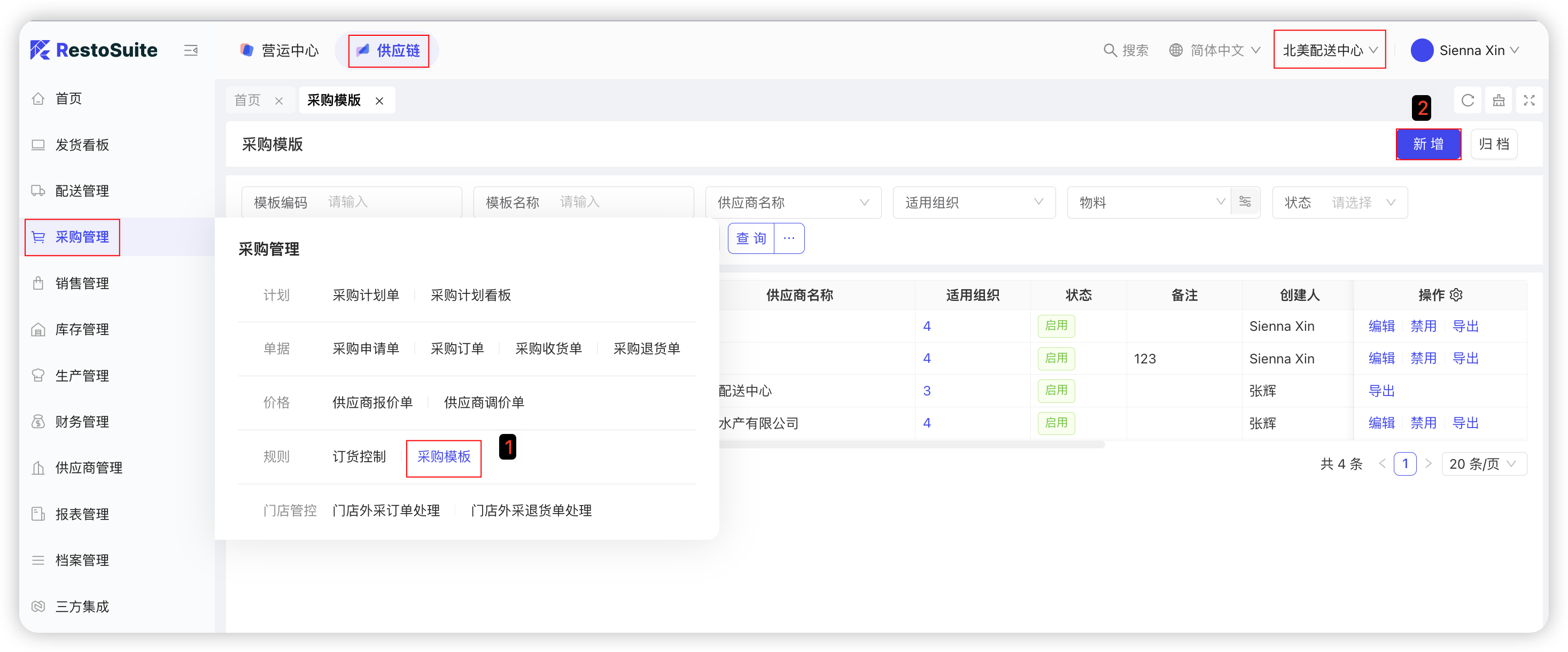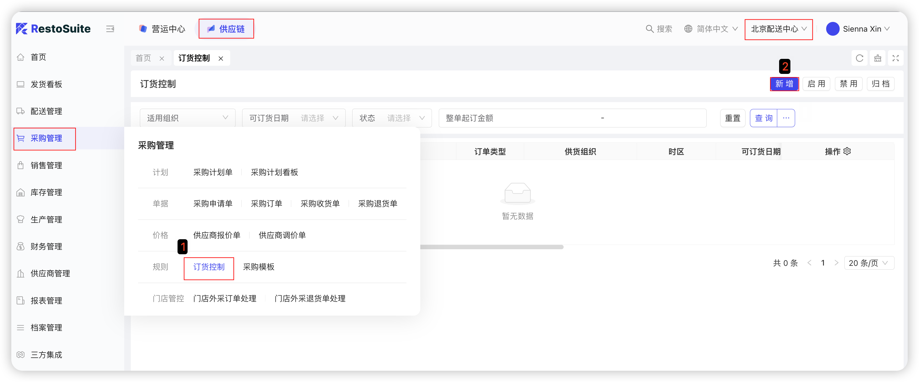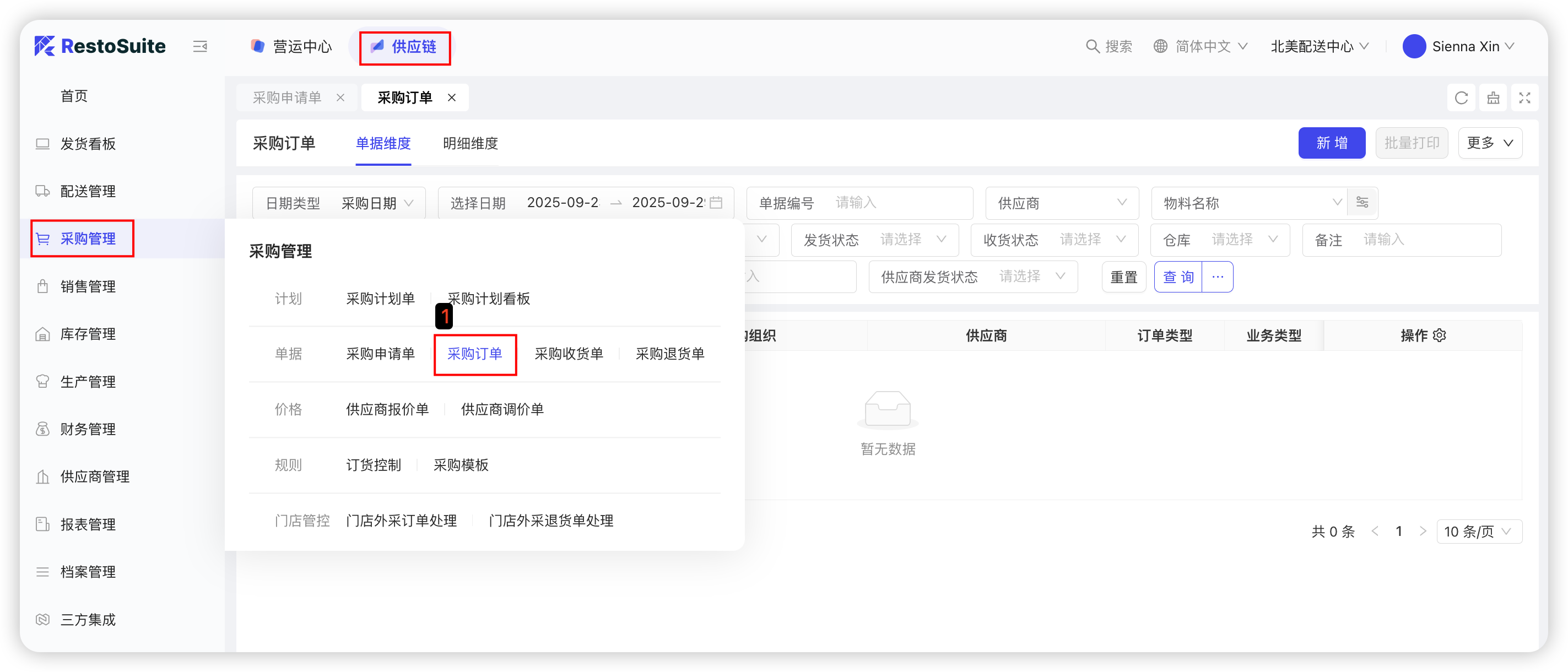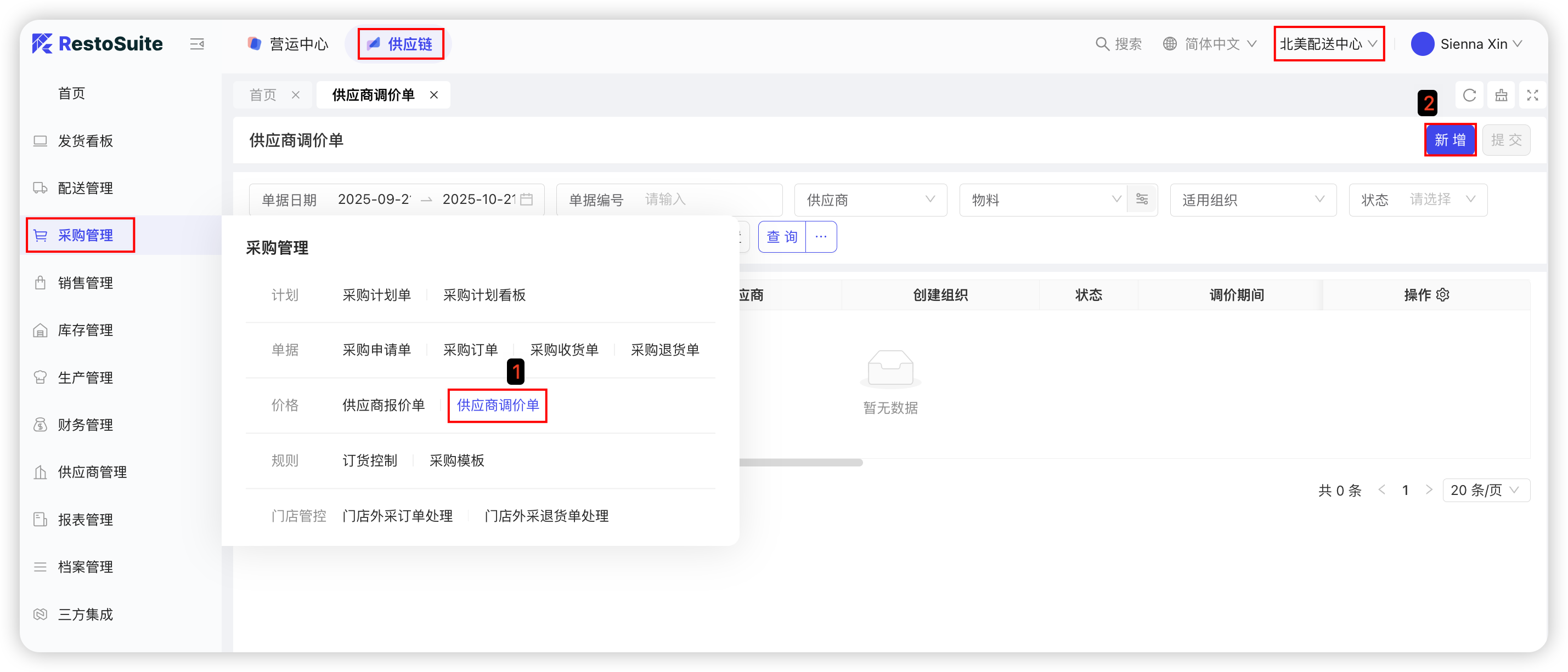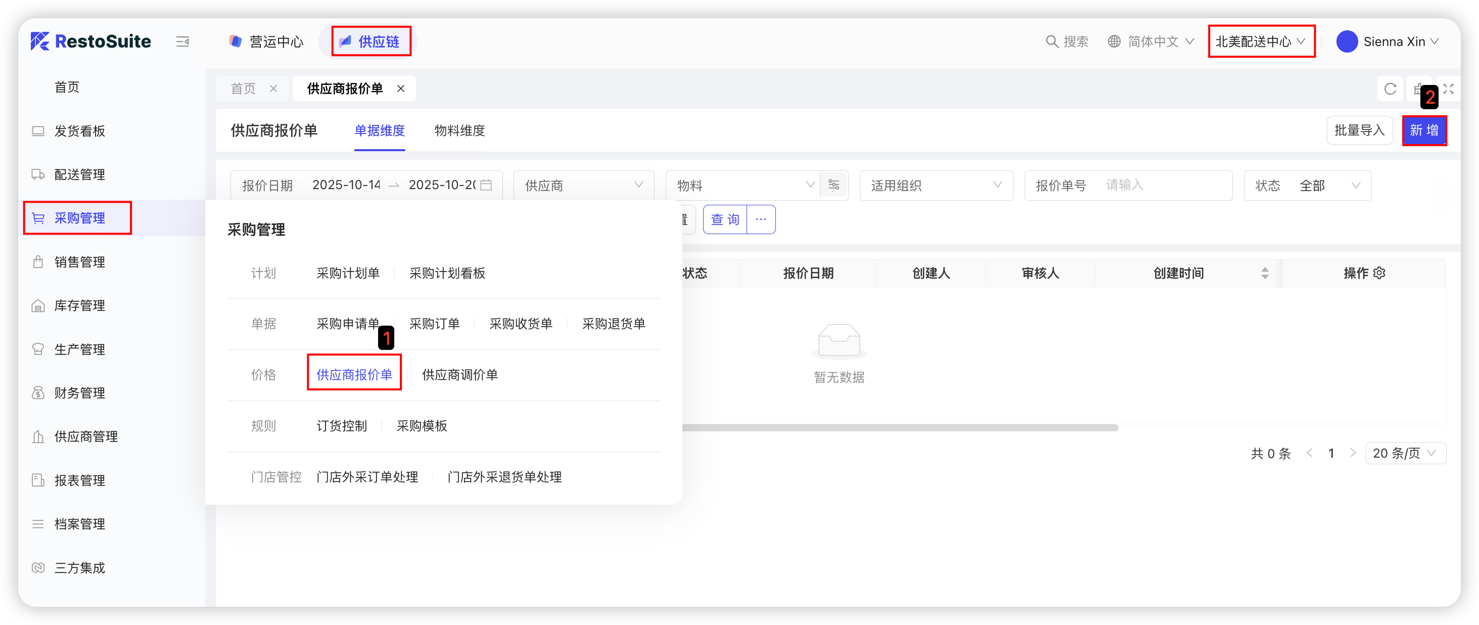 中央厨房供应商协同:配送中心仓库人员通过采购计划确定具体采购需求,采购人员根据采购计划清单进行线下寻源,确定具体供应商和采购价格后,在系统发起采购订单。