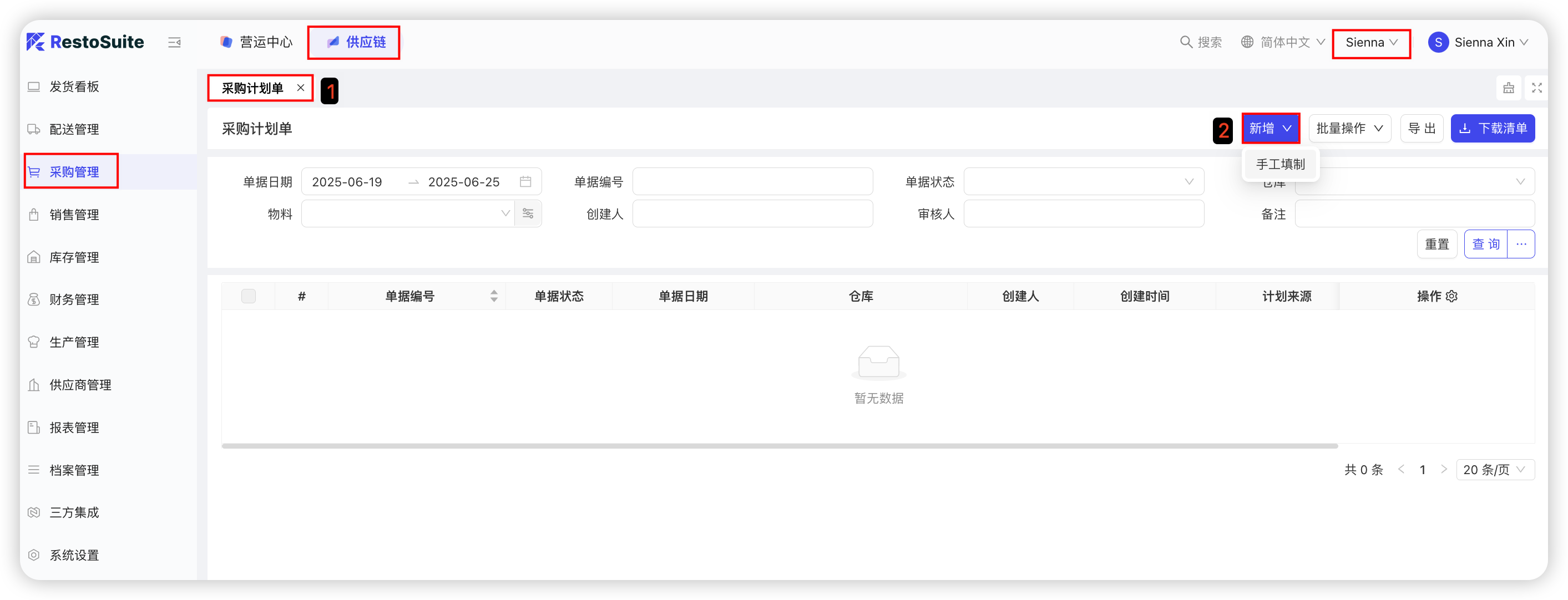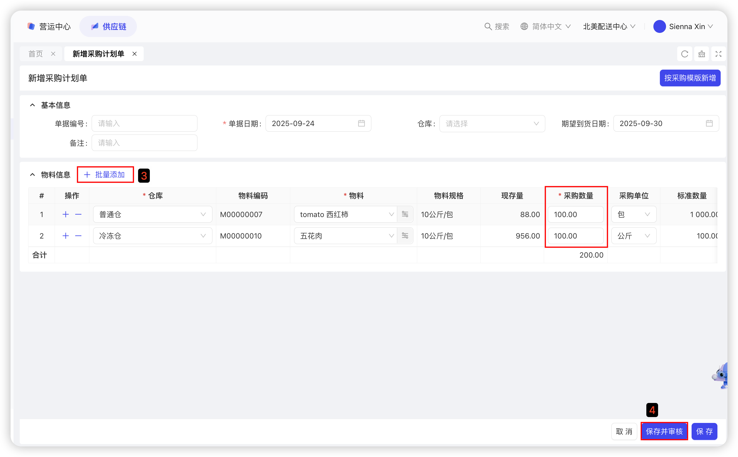 【配送中心视角-供应链板块-采购管理-采购计划】—点击【新增-手工填制】,支持按采购模板新增和批量添加—填写【物料采购数量、期望到货日期】—点击【保存并审核】,完成采购计划编制。具体截图如下: