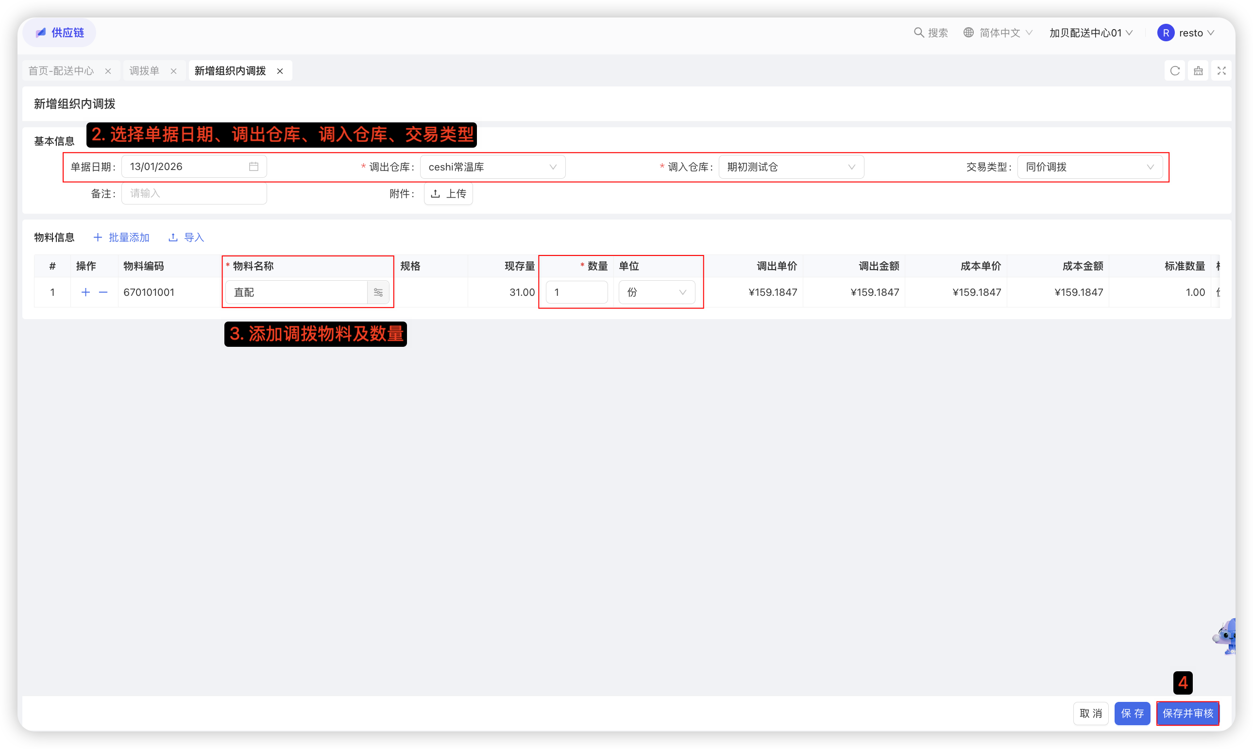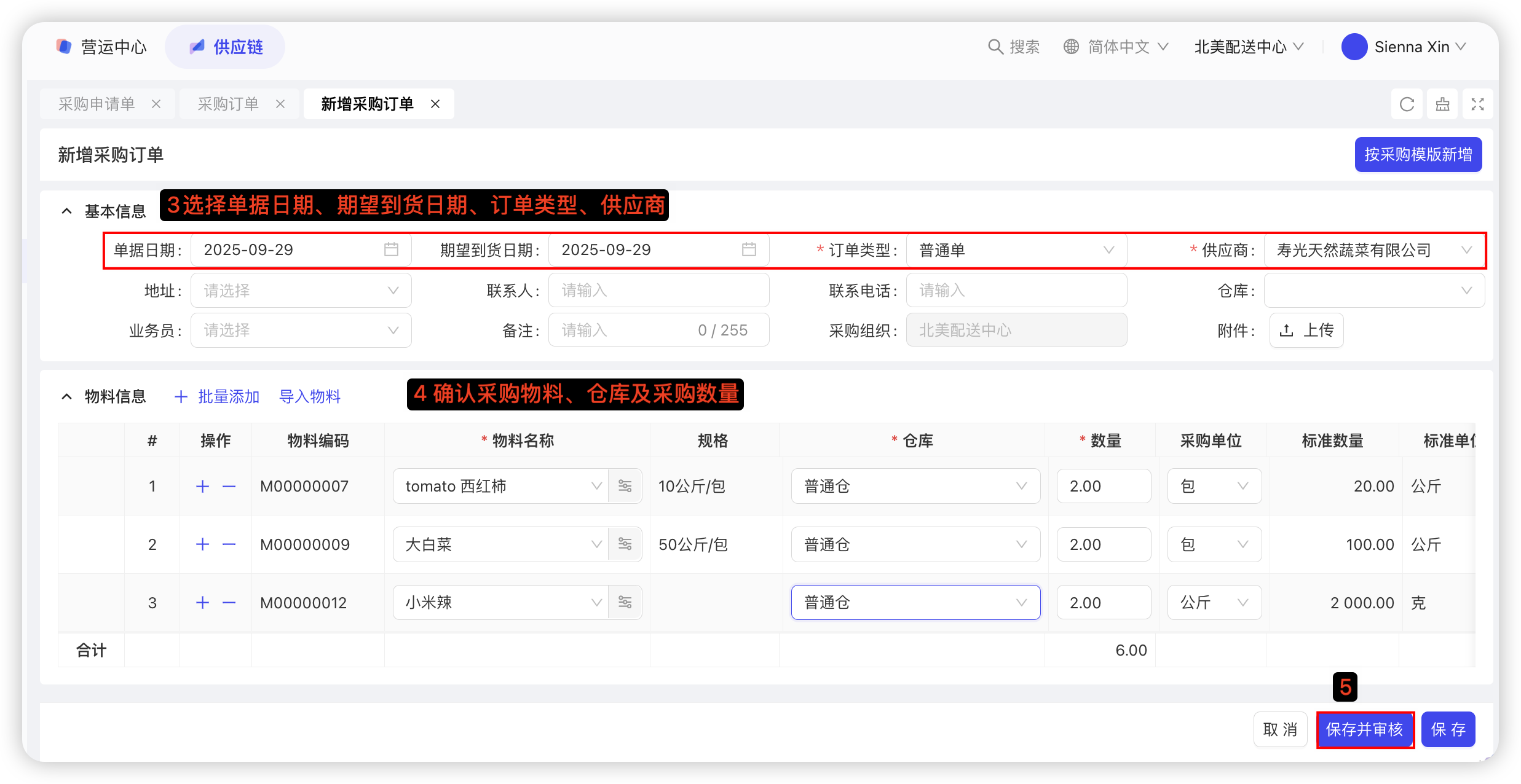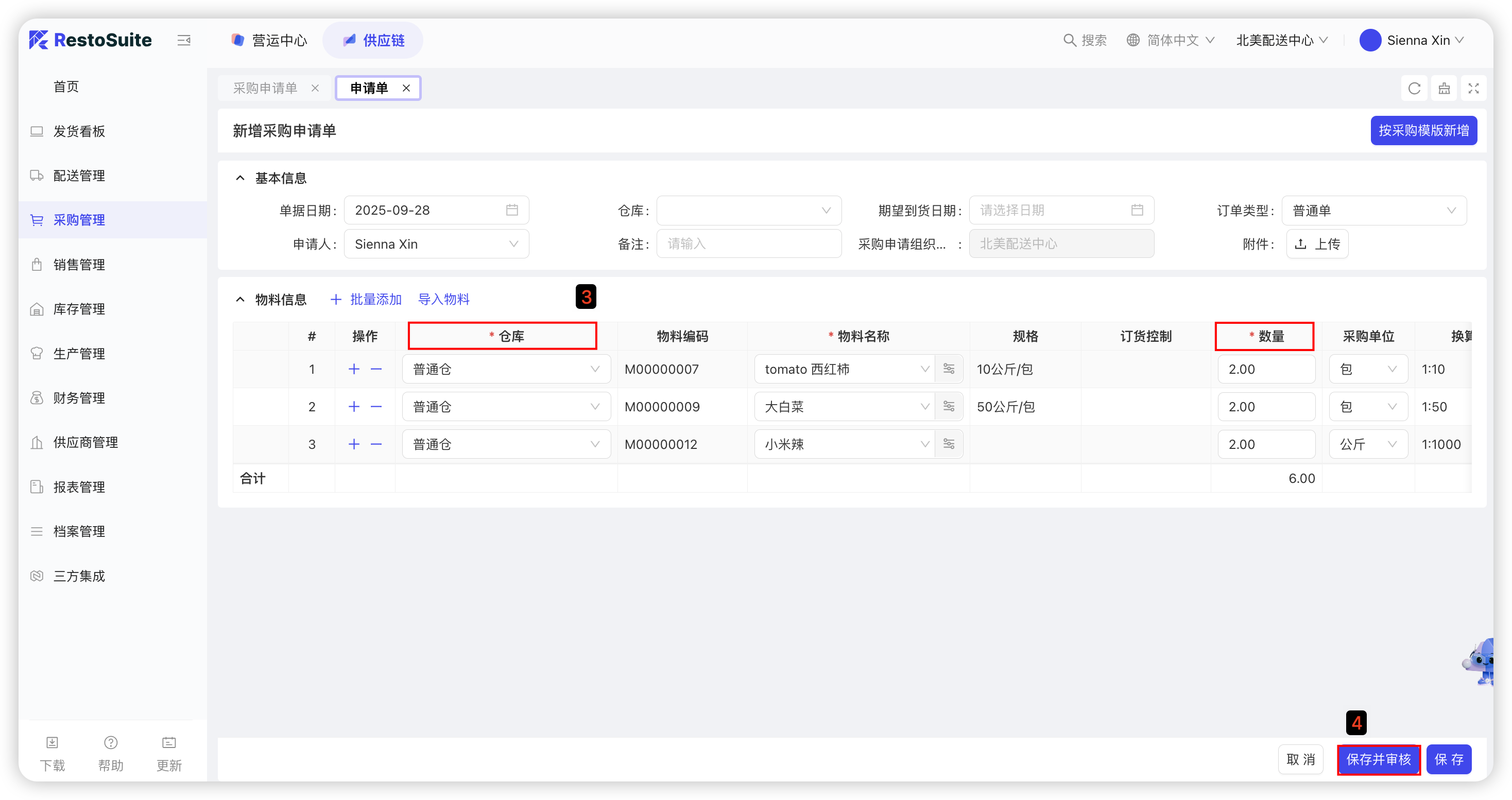 【配送中心视角-供应链板块-采购管理-采购申请单】—点击【新增-手工填制/按模板新增】—选择仓库、期望到货日期—填写各物料采购数量—点击【保存并审核】;若采购申请单未开启自动生成采购订单,则审核后需要在采购审核单页面点击【生成采购订单】;具体截图如下: