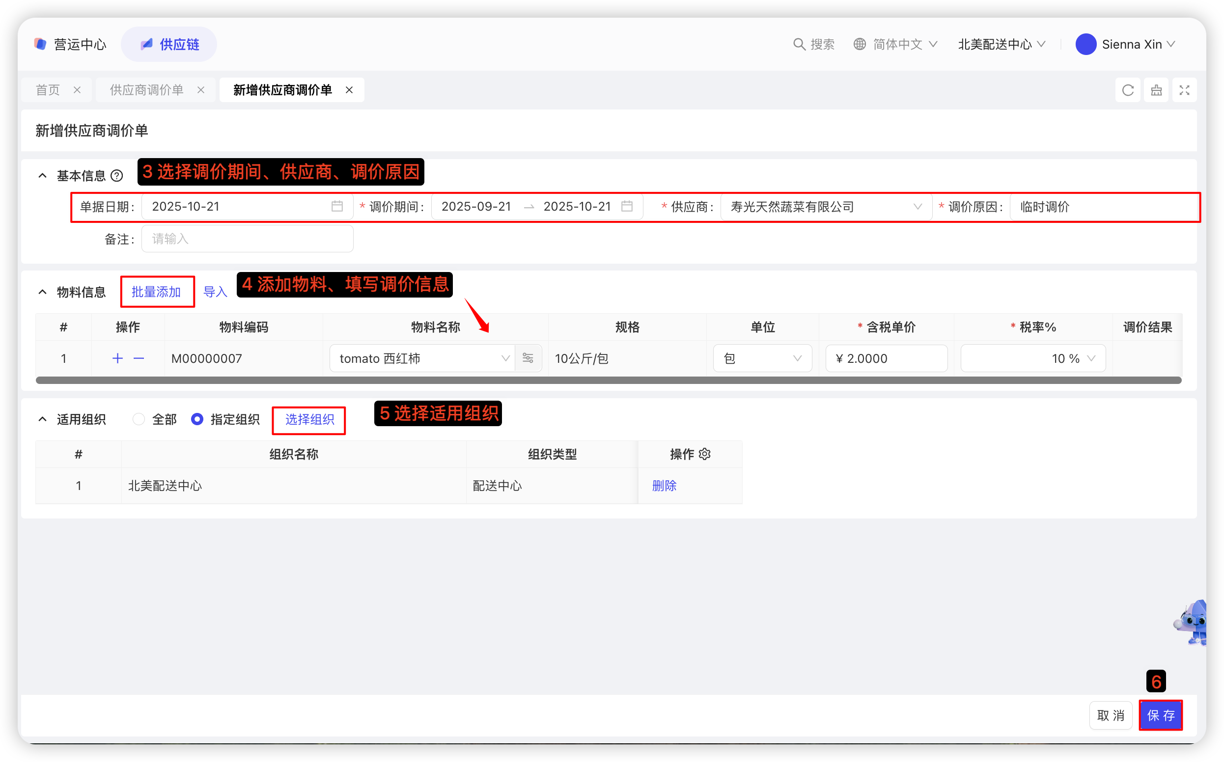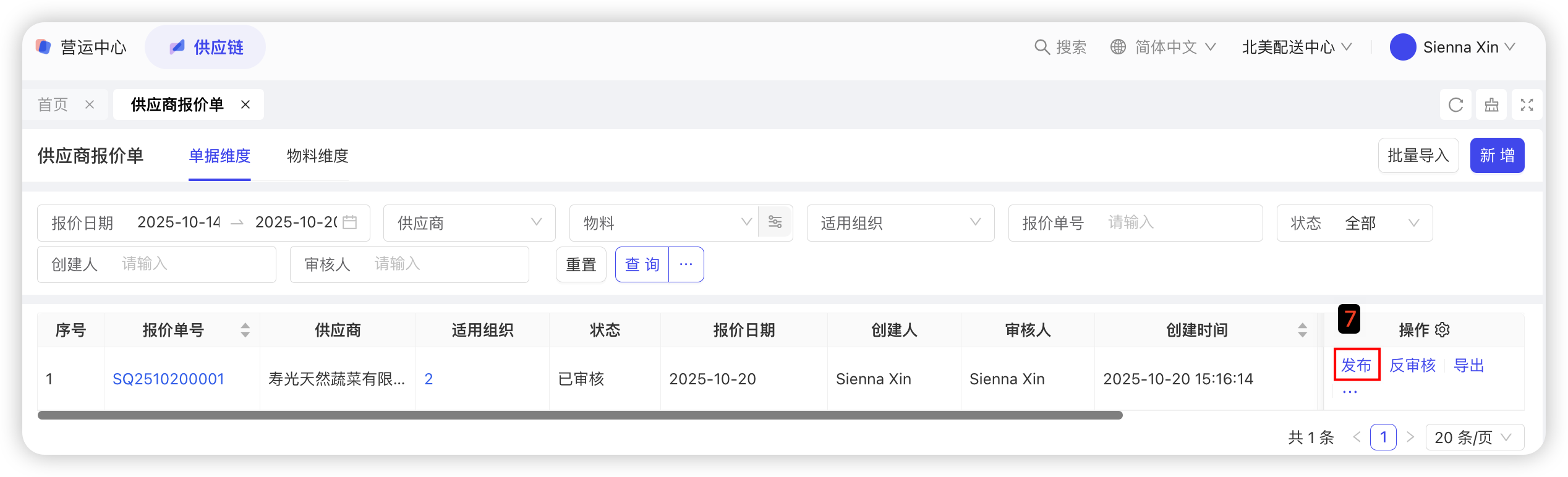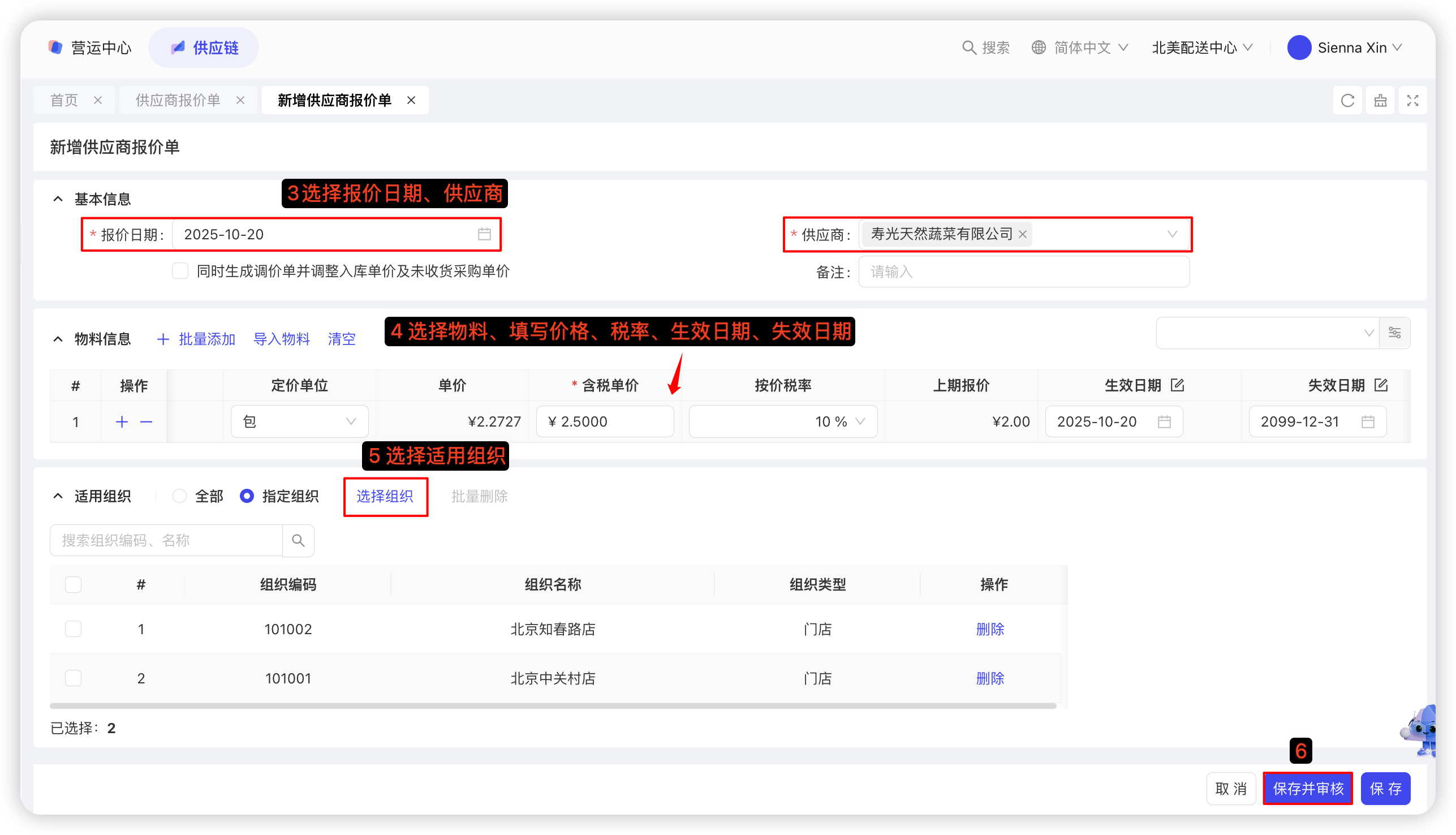 【配送中心视角-供应链板块-采购管理-供应商报价单】—点击【新增-手工填制】—选择报价日期、供应商—选择物料,填写价格、税率、生效日期、失效日期—选择适用组织—点击【保存并审核】—点击【发布】后,供应商报价单即可生效。具体截图如下: