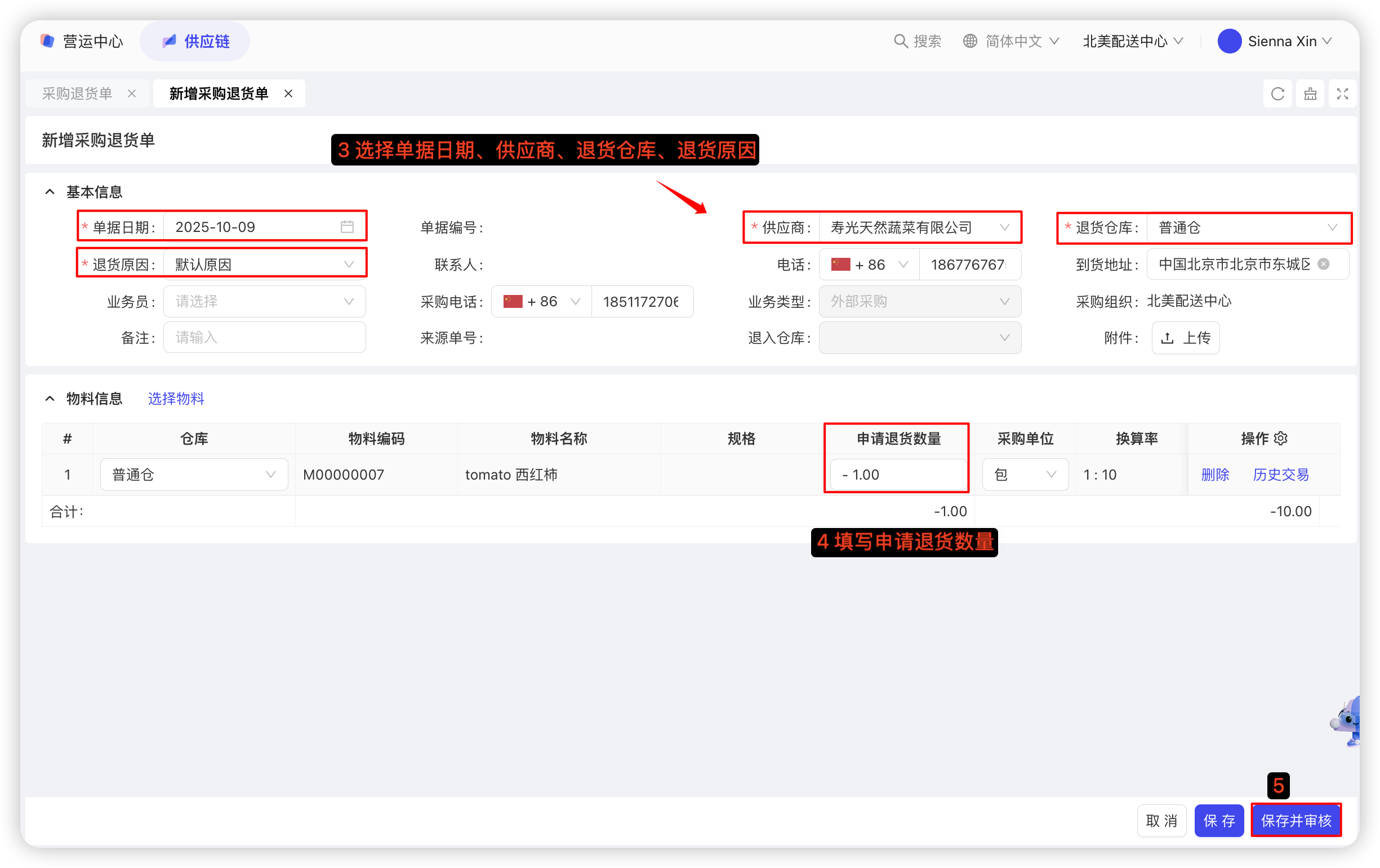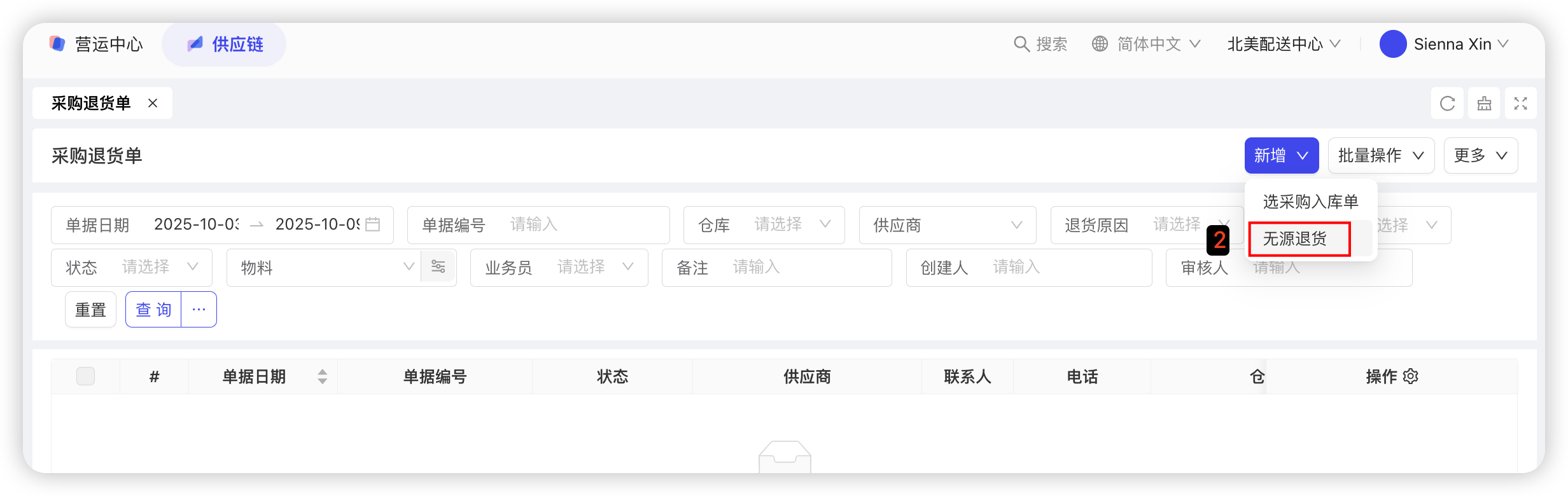 若选择无源单退货,具体操作如下:点击【新增,选择无源退货】—选择【单据日期、供应商、退货仓库、退货原因】—填写【申请退货数量】—点击【保存并审核】,具体截图如下:
