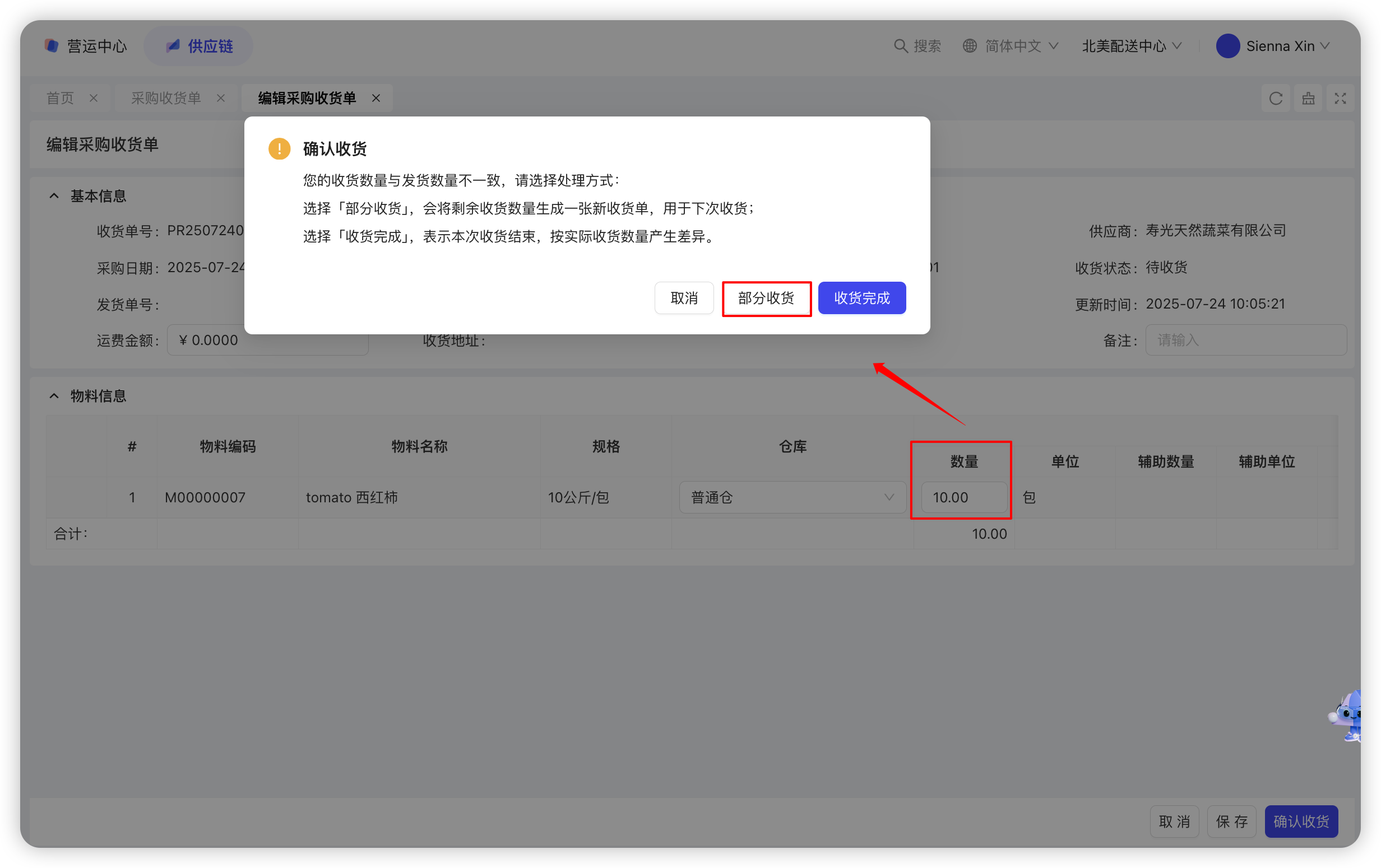 若存在多次收货,则输入收货数量后—点击【部分收货】,待下次到货后可继续进行收货操作,截图如下: