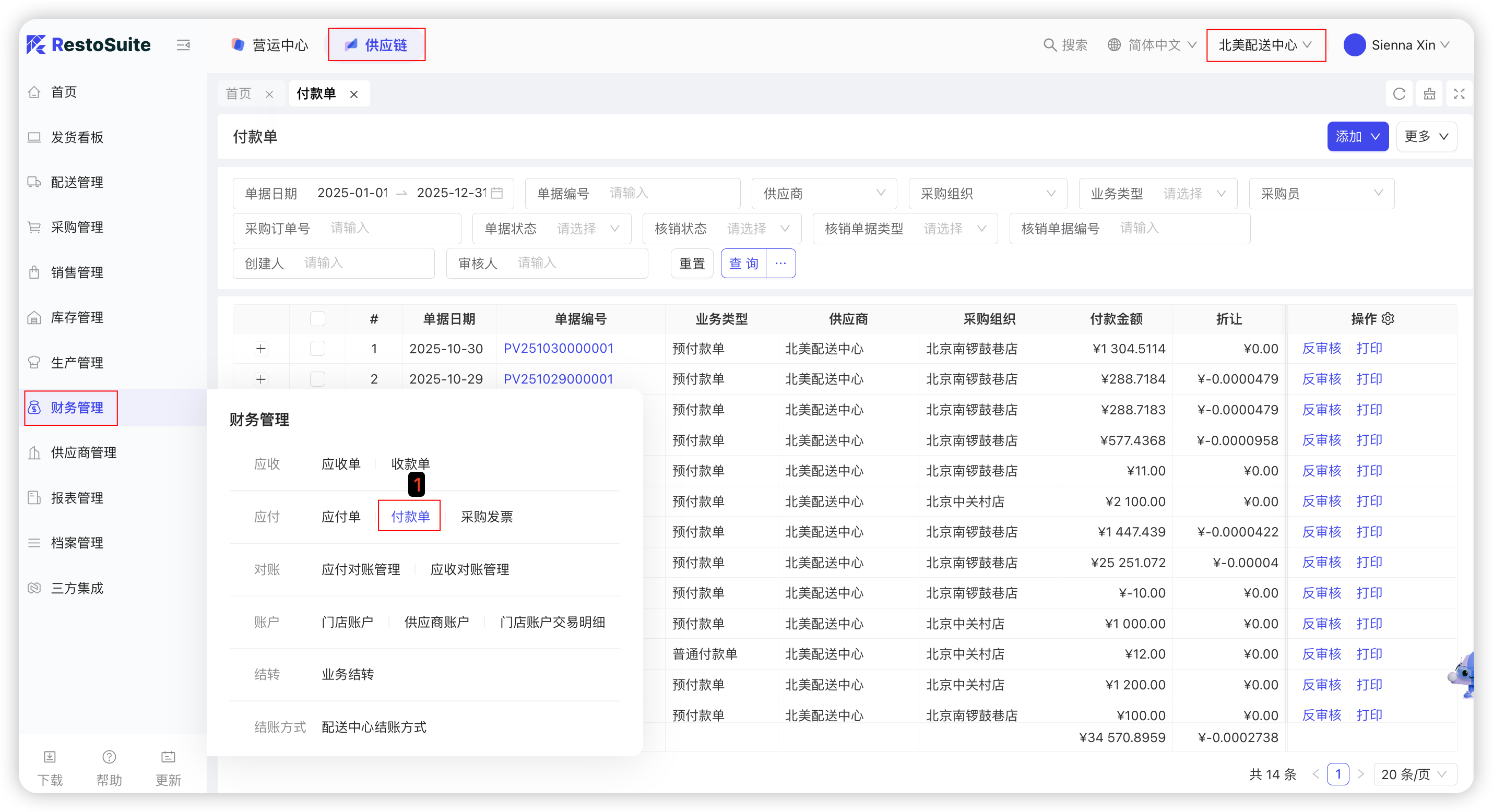 本功能用于中心/门店与外部供应商对账时用,应付单审核后才能对账,可在此批量生应付单、对账、付款、预付款核销、开发票等操作。