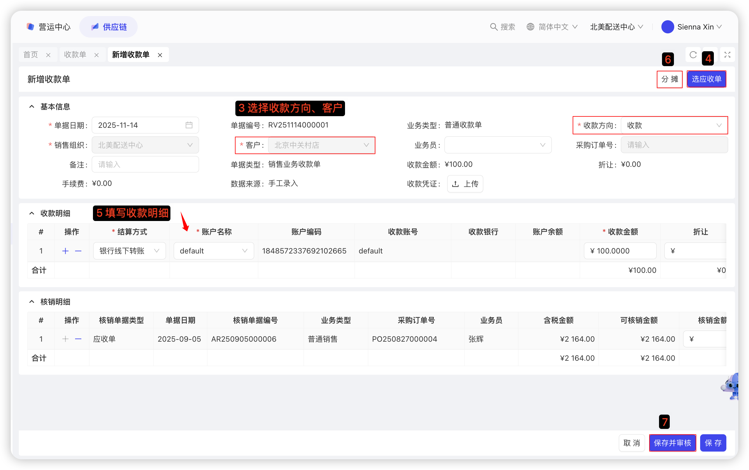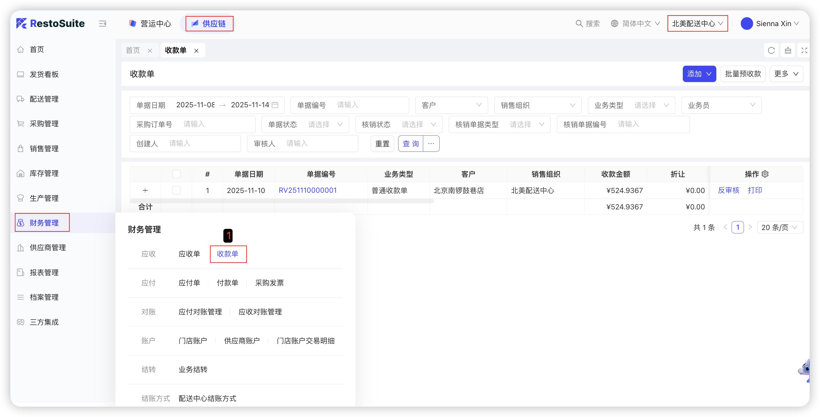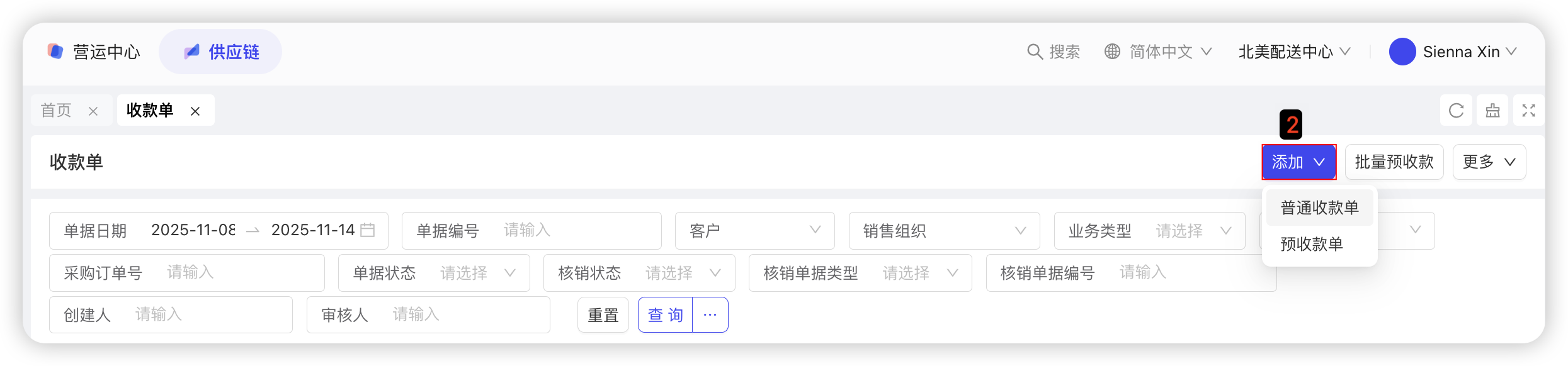 【集团视角/配送中心视角-供应链板块-财务管理-收款单】—点击【新增-预收收款/普通收款】: