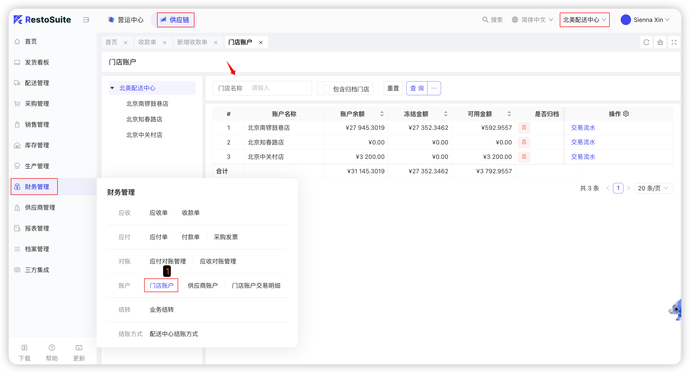 【集团视角/配送中心视角/门店视角-供应链板块-财务管理-门店账户流水】: